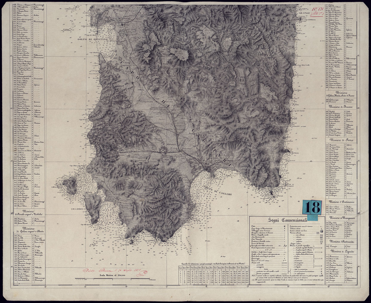 "La carta di base è quela del Gen la Marmora edita nel 1845. Questa carta è stata utilizzata per tutta la seconda metà dell'ottocento come unico documento cartografico valido per la rappresentazione dell'Isola. In questo caso la base cartografica è stata integrata con l'elenco delle miniere e dei giacimenti presenti sull'Isola. Questa copia è probabilmente la riproduzione dell'omonima carta al doc. 14. In alto a penna rossa vi è la scritta "Aprile 1870"."