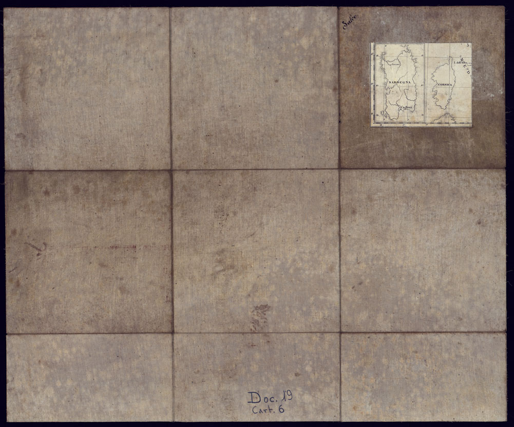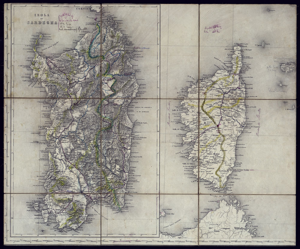 "La carta è parte dei sei fogli della Carta Corografica dell'Italia Superiore e Centrale alla scala di 1:600.000 pubblicata dall'Ufficio Superiore di S. M. nel 1865. Incisione del Cattaneo. La metà di sinistra di ciascun foglio è occupata dalla rappresentazione della Sardegna (tratteggio a luce obliqua), la metà di destra dalla rappresentazione planimetrica della Corsica."
