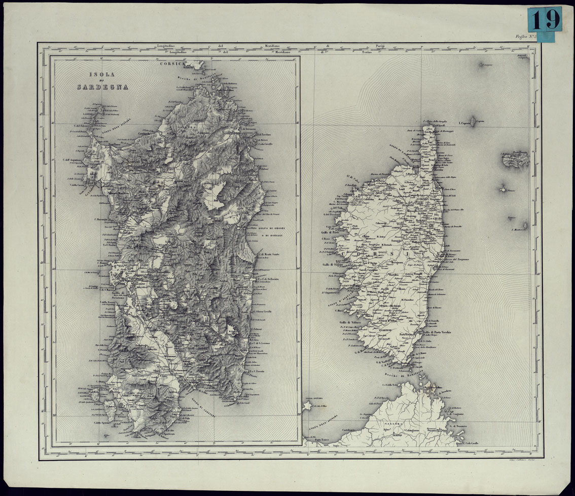 "La carta è parte dei sei fogli della Carta Corografica dell'Italia Superiore e Centrale alla scala di 1:600.000 pubblicata dall'Ufficio Superiore di S. M. nel 1865. Incisione del Cattaneo. La metà di sinistra di ciascun foglio è occupata dalla rappresentazione della Sardegna (tratteggio a luce obliqua), la metà di destra dalla rappresentazione planimetrica della Corsica."