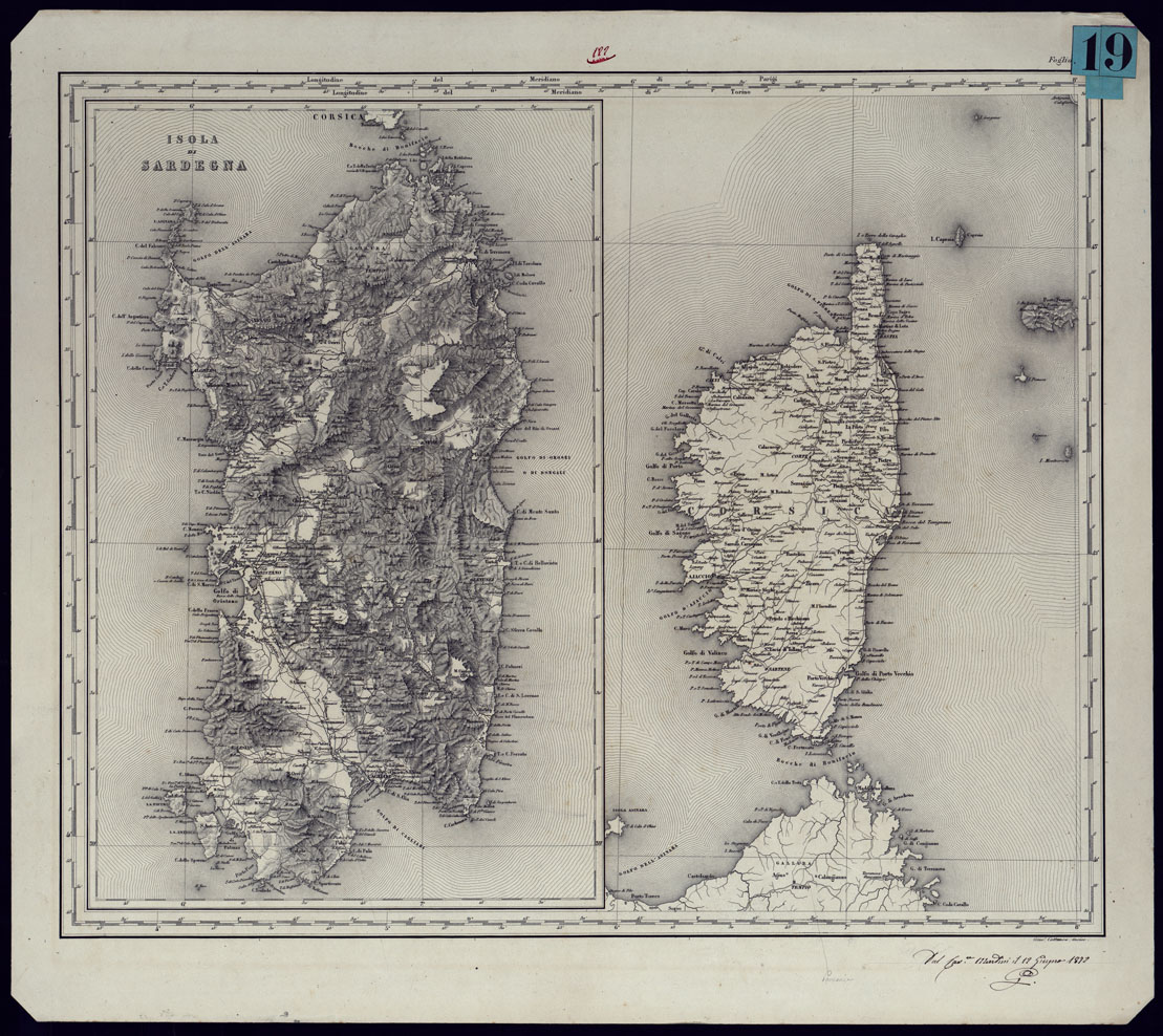"La carta è parte dei sei fogli della Carta Corografica dell'Italia Superiore e Centrale alla scala di 1:600.000 pubblicata dall'Ufficio Superiore di S. M. nel 1865. Incisione del Cattaneo. La metà di sinistra di ciascun foglio è occupata dalla rappresentazione della Sardegna (tratteggio a luce obliqua), la metà di destra dalla rappresentazione planimetrica della Corsica."
