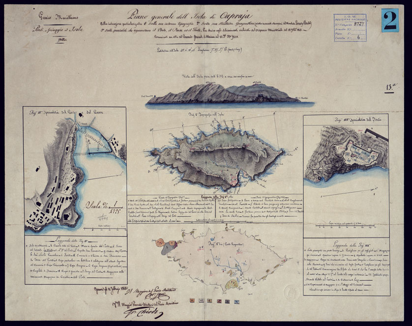 "Colla indicazione particolarizzata 1° della sua interna topografia 2° della sua struttura geognostica (ridotta da recenti osservazioni del Marchese Lorenzo Pareto) 3° delle specialità che riguardano il Porto, il Paese ed il Forte Per servire agli schiarimenti richiesti dalla Dispaccio Ministeriale del 18 sett. 1841. Comunicato con altro del Comando Generale di Marina del 21 dic. N° 7280. Un foglio manoscritto, ad acquerello, firmato dal Maggiore Generale Direttore del Genio Marittimo Chiodo. Contiene, oltre la cartina geognostica, una veduta dell'isola, la cartina topografica al 50.000, il piano del porto e del paese alla scala di 1:4.725, il piano del forte alla scala di 1:2.000, il tutto corredato di elenco numerico delle principali costruzioni. La posizione dell' isola è calcolata di 43°0'18" latitudine nord e 7°27'57" longitudine est."
