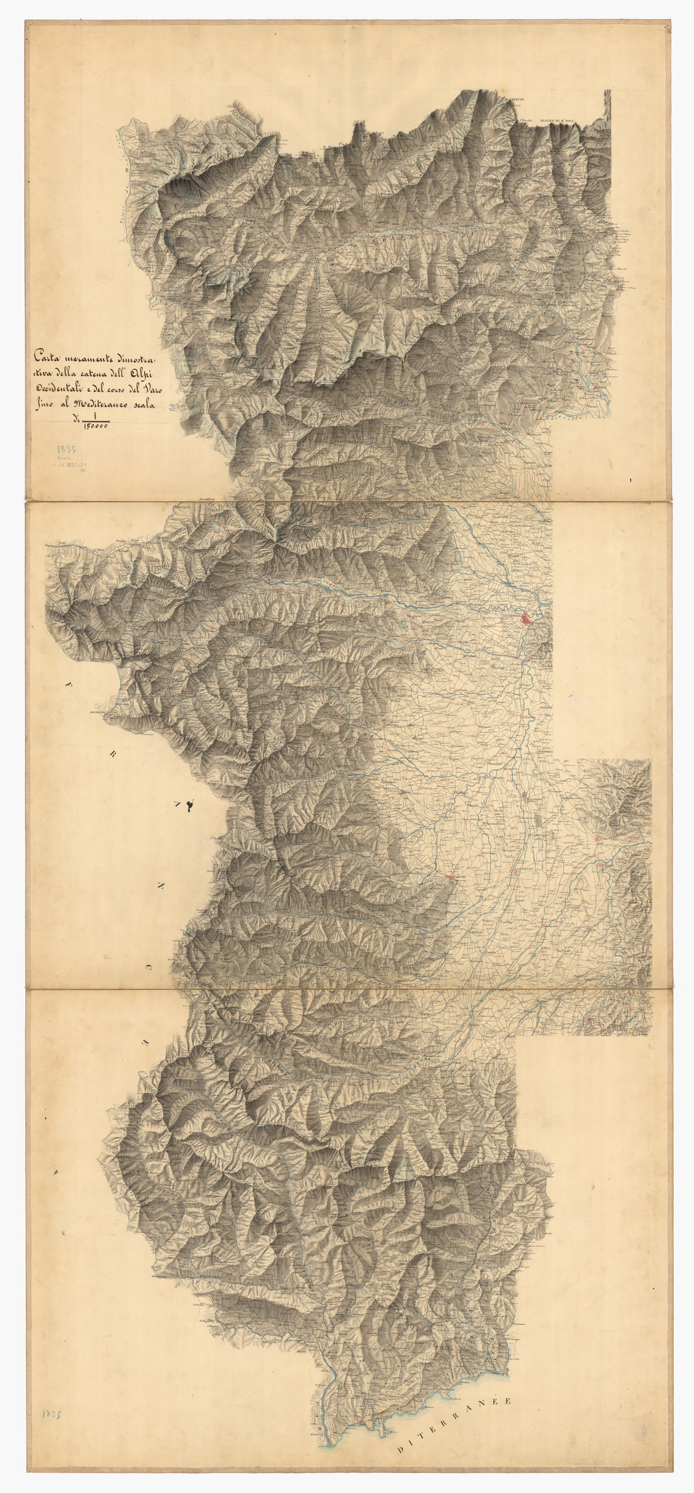 "Sulla carta è riportata la data 1935 che risulta essere errata e sostituita con le date 1825-1829. Disegno a penna a più colori, acquerellato, rappresentante la cerchia alpina dal Monte Bianco al mare e parte delle adiacenti vallate e pianure sino a Torino, in tre grandi fogli riuniti in foglio unico. Lavoro accuratissimo, di notevole effetto artistico per quanto riguarda specialmente il rilievo montano, assai ricco di nomi. Per tradizione di ufficio viene attribuito all'ingegnere topografo V.A.M. Brambilla."