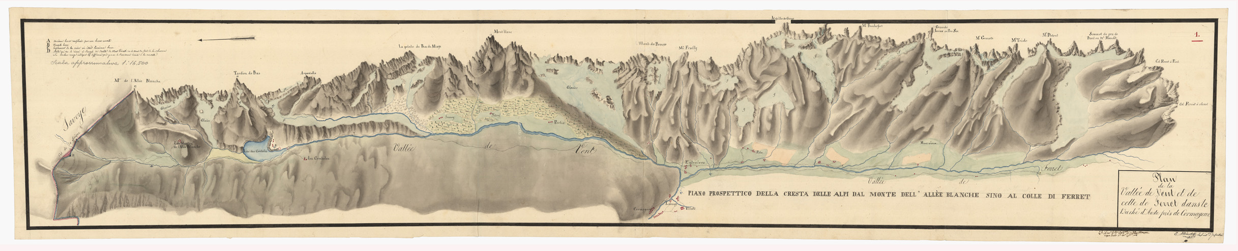 "Veduta prospettica artisticamente acquerellata della cresta alpina tra il Col de la Seigne e il Col Ferret. Alcune indicazioni speciali di vecchi e nuovi termini al Col de la Seigne indicherebbero che questa veduta fu disegnata a scopo di confinamento. Firmata E. Allianet Sous Lieut. d'Infanterie e V° il M.r G. le Barone di Monthoux capo dello S.M.G."