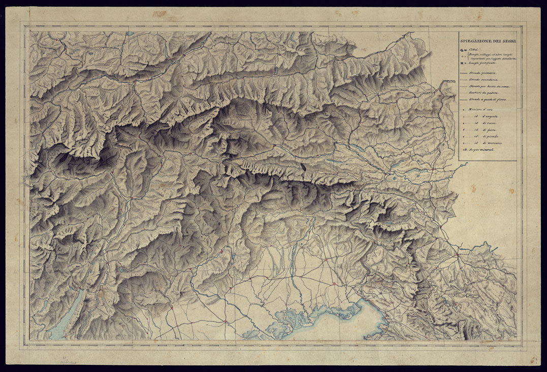 "Il titolo non è presente sulla carta. Disegni accuratissimi acquerellati del celebre topografo Ing. Vittorio Brambilla con numerose indicazioni di carattere fisiografico e ricca nomenclatura, riproducenti il profilo geometrico della cerchia Alpina. Sono gli originali delle tavole che accompagnano l'opera "Le Alpi che cingono l'Italia consideramilitarmente così nell'antica come, nella presente loro condizione" pubbliacata a Torino nel 1845, per cura del Quartier Maestro Generale dell'Esercito Sardo ANNIBALE DI SALUZZO."