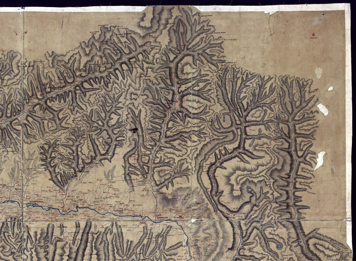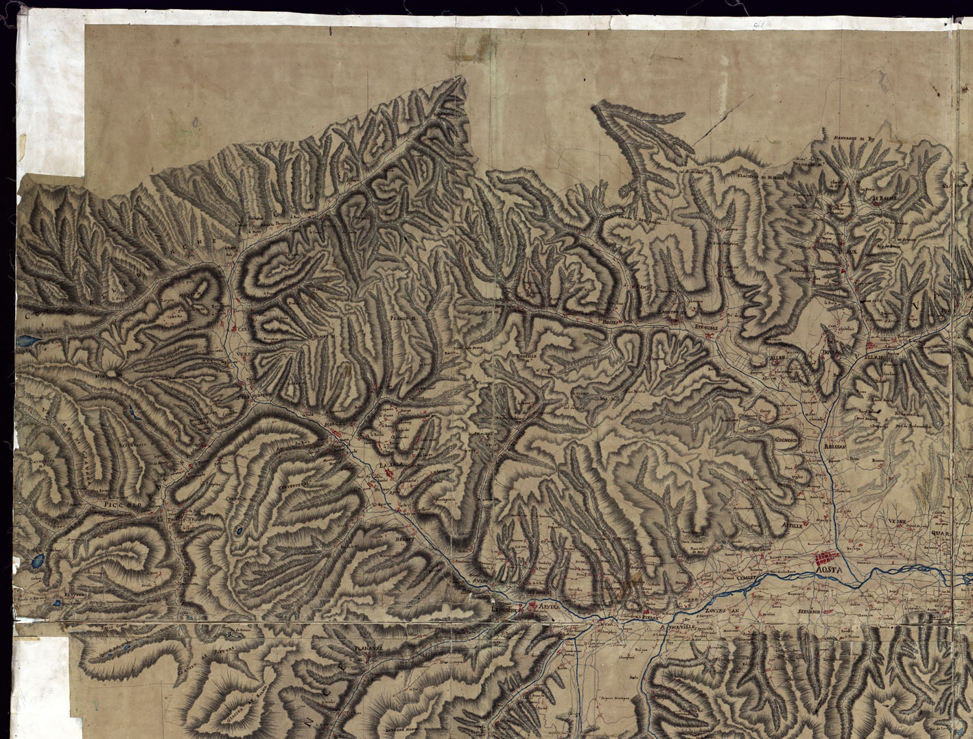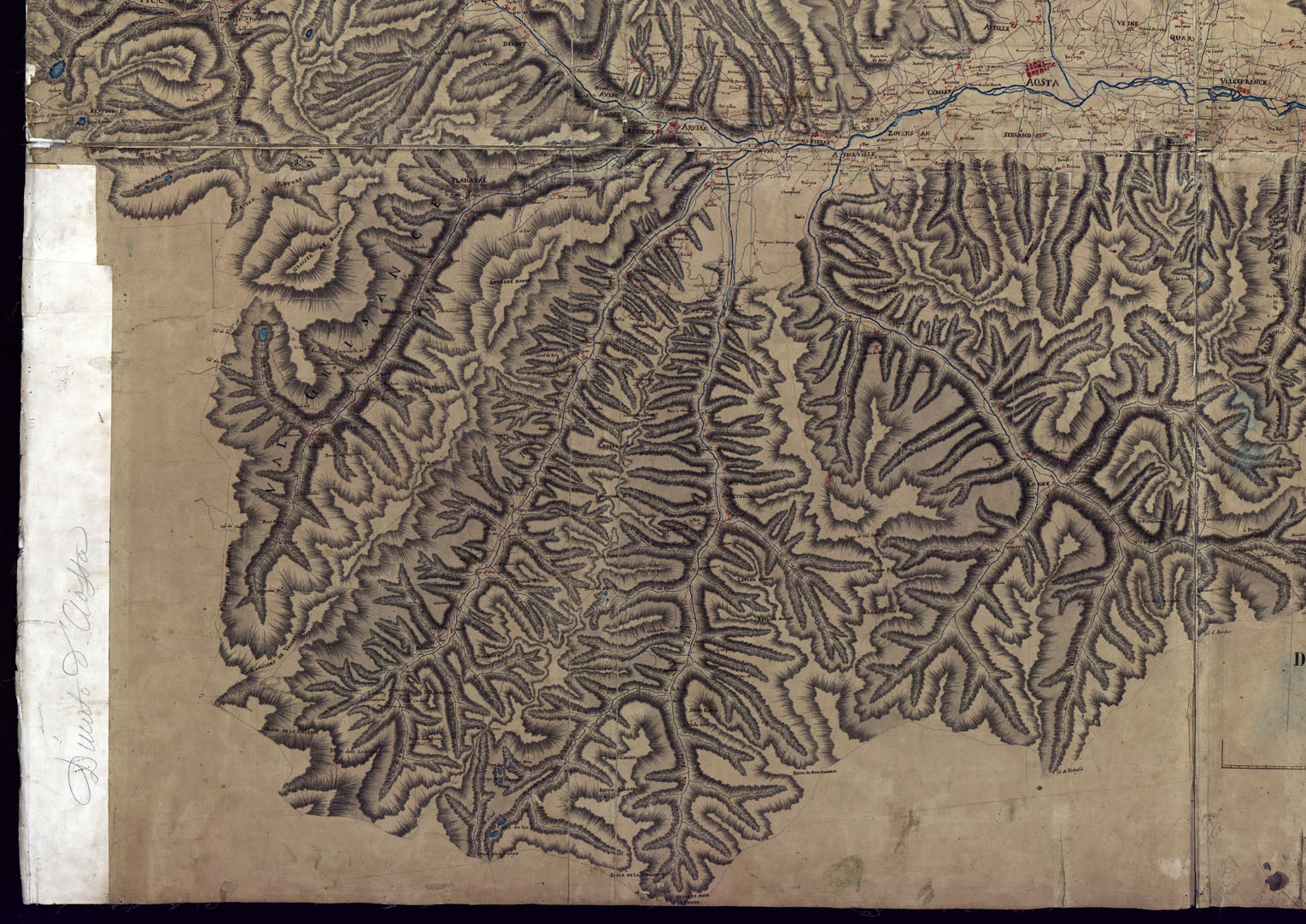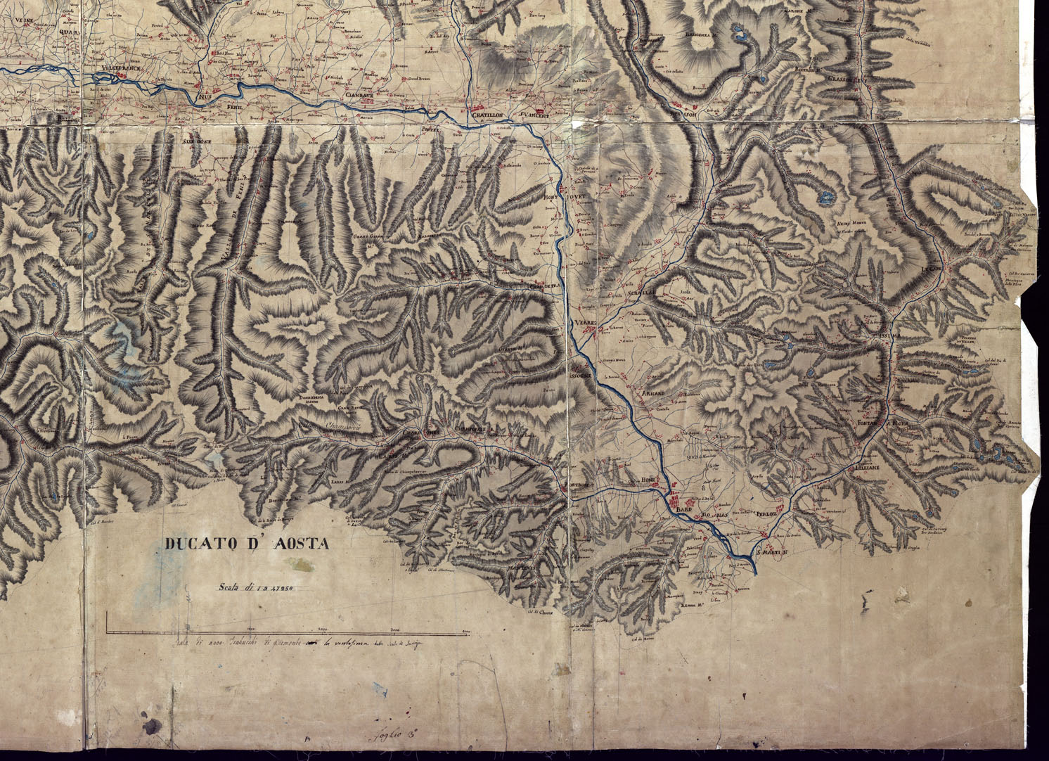 "Disegno a penna con orografia a tratteggio zenitale in più fogli riuniti in un unico quadro montato su tela. Scala grafica di 5.000 trabucchi metri 3,07 (1:47.250 circa), "la ventisima della scala di Savoia" (così una nota in penna) senza indicazione di data, nè di autore. Si può ritenere dei primi del secolo XIX. Rappresenta il territorio dell'antico ducato di Aosta, ossia la valle omonima a Monte di Bard."