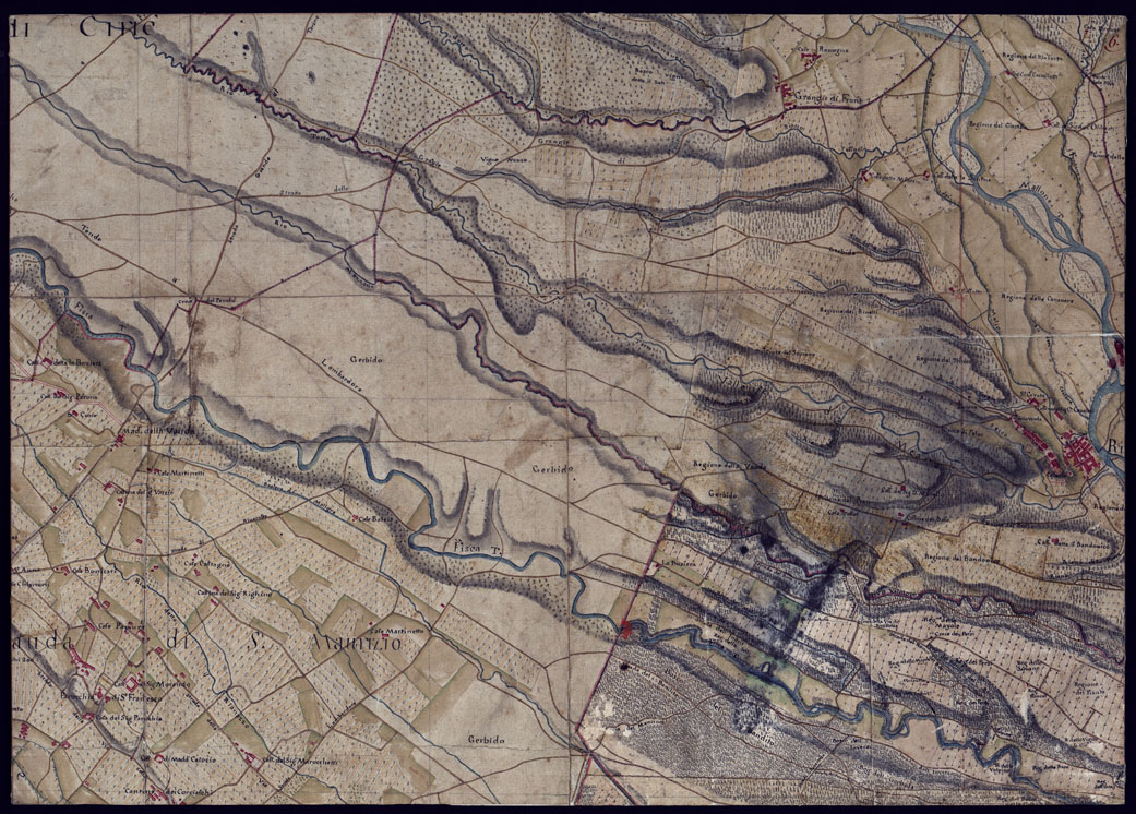 "Disegno a penna, in 37 fogli, oltre un quadro d'unione, rappresentante il territorio Canavese e i Comuni limitrofi (Gassino, S. Mauro Torinese, Castiglion Torinese e Pavarolo) e cioè la regione compresa tra Ciriè, S. Mauro, il corso del Po e la Dora Baltea. Scala di 300 trabucchi = m.0,098, pari a 1:9.450. Secondo indicazioni di archivio risulterebbe formato dalla riduzione di mappe catastali. Non porta indicazioni di data , ma si può ritenere del primo quarto del secolo XIX. Sopra alcuni fogli che appaiano diversamente ritagliati da come erano originariamente, si legge: " Originale dai Signor Avico, Borgiotti Cantù e Marchetti". Il disegno, abbastanza accurato, riproduce con notevole precisione, come comporta la scala, tutti i particolari topografici del territorio rappresentato cioè corsi d'acqua, rete stradale, fabbricati, limiti amministrativi. Il rilievo del suolo è rappresentato con ombreggiatura ad acquerello. Mediante colori a segni convenzionali sono indicate le colture e i boschi. Ricchissima anche la toponomastica. In complesso un eccellente documento topografico di grande interesse per lo studio delle variazioni fisiografiche ed antropogeografiche della regione."