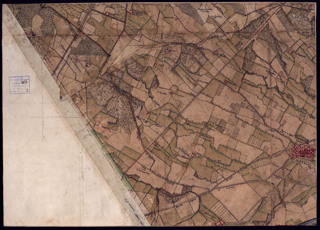 "Disegno a penna, in 37 fogli, oltre un quadro d'unione, rappresentante il territorio Canavese e i Comuni limitrofi (Gassino, S. Mauro Torinese, Castiglion Torinese e Pavarolo) e cioè la regione compresa tra Ciriè, S. Mauro, il corso del Po e la Dora Baltea. Scala di 300 trabucchi = m.0,098, pari a 1:9.450. Secondo indicazioni di archivio risulterebbe formato dalla riduzione di mappe catastali. Non porta indicazioni di data , ma si può ritenere del primo quarto del secolo XIX. Sopra alcuni fogli che appaiano diversamente ritagliati da come erano originariamente, si legge: " Originale dai Signor Avico, Borgiotti Cantù e Marchetti". Il disegno, abbastanza accurato, riproduce con notevole precisione, come comporta la scala, tutti i particolari topografici del territorio rappresentato cioè corsi d'acqua, rete stradale, fabbricati, limiti amministrativi. Il rilievo del suolo è rappresentato con ombreggiatura ad acquerello. Mediante colori a segni convenzionali sono indicate le colture e i boschi. Ricchissima anche la toponomastica. In complesso un eccellente documento topografico di grande interesse per lo studio delle variazioni fisiografiche ed antropogeografiche della regione."