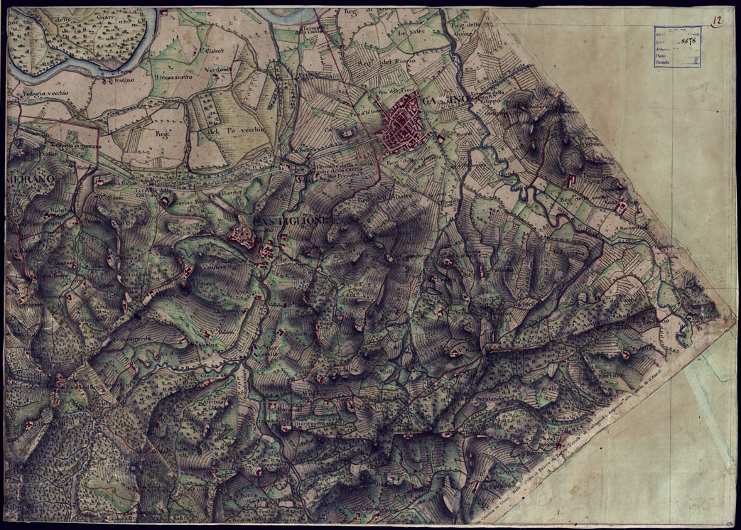 "Disegno a penna, in 37 fogli, oltre un quadro d'unione, rappresentante il territorio Canavese e i Comuni limitrofi (Gassino, S. Mauro Torinese, Castiglion Torinese e Pavarolo) e cioè la regione compresa tra Ciriè, S. Mauro, il corso del Po e la Dora Baltea. Scala di 300 trabucchi = m.0,098, pari a 1:9.450. Secondo indicazioni di archivio risulterebbe formato dalla riduzione di mappe catastali. Non porta indicazioni di data , ma si può ritenere del primo quarto del secolo XIX. Sopra alcuni fogli che appaiano diversamente ritagliati da come erano originariamente, si legge: " Originale dai Signor Avico, Borgiotti Cantù e Marchetti". Il disegno, abbastanza accurato, riproduce con notevole precisione, come comporta la scala, tutti i particolari topografici del territorio rappresentato cioè corsi d'acqua, rete stradale, fabbricati, limiti amministrativi. Il rilievo del suolo è rappresentato con ombreggiatura ad acquerello. Mediante colori a segni convenzionali sono indicate le colture e i boschi. Ricchissima anche la toponomastica. In complesso un eccellente documento topografico di grande interesse per lo studio delle variazioni fisiografiche ed antropogeografiche della regione."