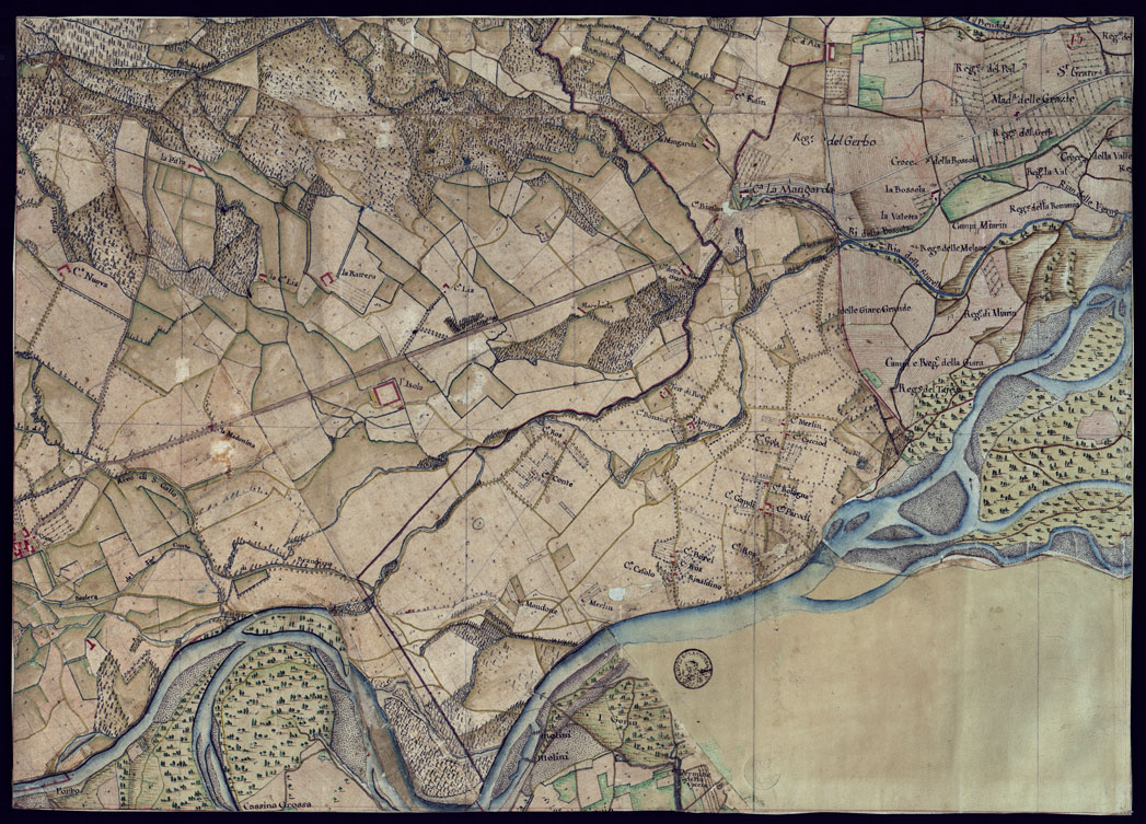"Disegno a penna, in 37 fogli, oltre un quadro d'unione, rappresentante il territorio Canavese e i Comuni limitrofi (Gassino, S. Mauro Torinese, Castiglion Torinese e Pavarolo) e cioè la regione compresa tra Ciriè, S. Mauro, il corso del Po e la Dora Baltea. Scala di 300 trabucchi = m.0,098, pari a 1:9.450. Secondo indicazioni di archivio risulterebbe formato dalla riduzione di mappe catastali. Non porta indicazioni di data , ma si può ritenere del primo quarto del secolo XIX. Sopra alcuni fogli che appaiano diversamente ritagliati da come erano originariamente, si legge: " Originale dai Signor Avico, Borgiotti Cantù e Marchetti". Il disegno, abbastanza accurato, riproduce con notevole precisione, come comporta la scala, tutti i particolari topografici del territorio rappresentato cioè corsi d'acqua, rete stradale, fabbricati, limiti amministrativi. Il rilievo del suolo è rappresentato con ombreggiatura ad acquerello. Mediante colori a segni convenzionali sono indicate le colture e i boschi. Ricchissima anche la toponomastica. In complesso un eccellente documento topografico di grande interesse per lo studio delle variazioni fisiografiche ed antropogeografiche della regione."