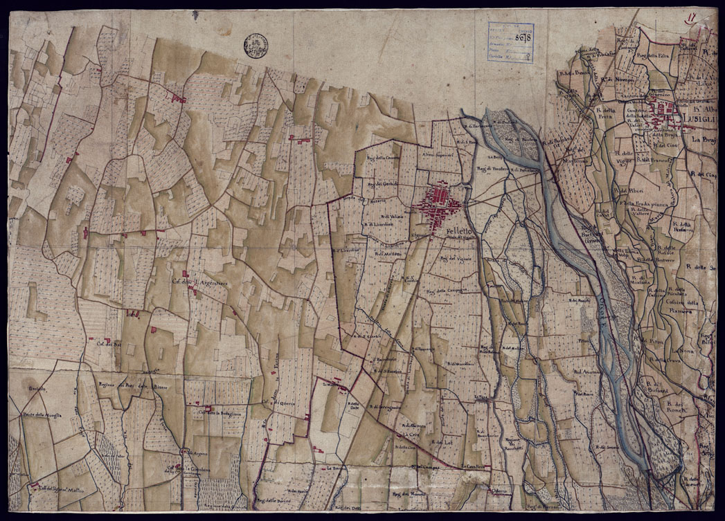 "Disegno a penna, in 37 fogli, oltre un quadro d'unione, rappresentante il territorio Canavese e i Comuni limitrofi (Gassino, S. Mauro Torinese, Castiglion Torinese e Pavarolo) e cioè la regione compresa tra Ciriè, S. Mauro, il corso del Po e la Dora Baltea. Scala di 300 trabucchi = m.0,098, pari a 1:9.450. Secondo indicazioni di archivio risulterebbe formato dalla riduzione di mappe catastali. Non porta indicazioni di data , ma si può ritenere del primo quarto del secolo XIX. Sopra alcuni fogli che appaiano diversamente ritagliati da come erano originariamente, si legge: " Originale dai Signor Avico, Borgiotti Cantù e Marchetti". Il disegno, abbastanza accurato, riproduce con notevole precisione, come comporta la scala, tutti i particolari topografici del territorio rappresentato cioè corsi d'acqua, rete stradale, fabbricati, limiti amministrativi. Il rilievo del suolo è rappresentato con ombreggiatura ad acquerello. Mediante colori a segni convenzionali sono indicate le colture e i boschi. Ricchissima anche la toponomastica. In complesso un eccellente documento topografico di grande interesse per lo studio delle variazioni fisiografiche ed antropogeografiche della regione."