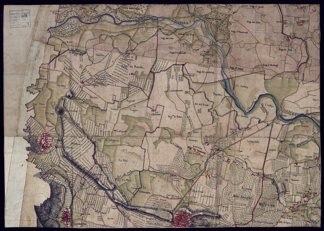 "Disegno a penna, in 37 fogli, oltre un quadro d'unione, rappresentante il territorio Canavese e i Comuni limitrofi (Gassino, S. Mauro Torinese, Castiglion Torinese e Pavarolo) e cioè la regione compresa tra Ciriè, S. Mauro, il corso del Po e la Dora Baltea. Scala di 300 trabucchi = m.0,098, pari a 1:9.450. Secondo indicazioni di archivio risulterebbe formato dalla riduzione di mappe catastali. Non porta indicazioni di data , ma si può ritenere del primo quarto del secolo XIX. Sopra alcuni fogli che appaiano diversamente ritagliati da come erano originariamente, si legge: " Originale dai Signor Avico, Borgiotti Cantù e Marchetti". Il disegno, abbastanza accurato, riproduce con notevole precisione, come comporta la scala, tutti i particolari topografici del territorio rappresentato cioè corsi d'acqua, rete stradale, fabbricati, limiti amministrativi. Il rilievo del suolo è rappresentato con ombreggiatura ad acquerello. Mediante colori a segni convenzionali sono indicate le colture e i boschi. Ricchissima anche la toponomastica. In complesso un eccellente documento topografico di grande interesse per lo studio delle variazioni fisiografiche ed antropogeografiche della regione."