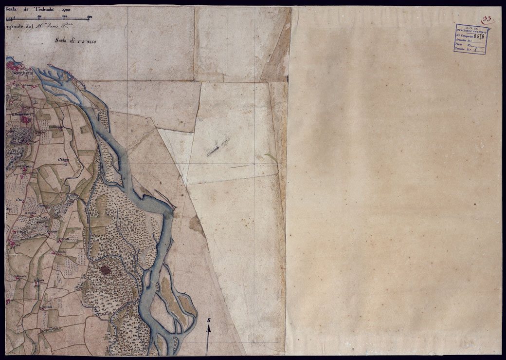 "Disegno a penna, in 37 fogli, oltre un quadro d'unione, rappresentante il territorio Canavese e i Comuni limitrofi (Gassino, S. Mauro Torinese, Castiglion Torinese e Pavarolo) e cioè la regione compresa tra Ciriè, S. Mauro, il corso del Po e la Dora Baltea. Scala di 300 trabucchi = m.0,098, pari a 1:9.450. Secondo indicazioni di archivio risulterebbe formato dalla riduzione di mappe catastali. Non porta indicazioni di data , ma si può ritenere del primo quarto del secolo XIX. Sopra alcuni fogli che appaiano diversamente ritagliati da come erano originariamente, si legge: " Originale dai Signor Avico, Borgiotti Cantù e Marchetti". Il disegno, abbastanza accurato, riproduce con notevole precisione, come comporta la scala, tutti i particolari topografici del territorio rappresentato cioè corsi d'acqua, rete stradale, fabbricati, limiti amministrativi. Il rilievo del suolo è rappresentato con ombreggiatura ad acquerello. Mediante colori a segni convenzionali sono indicate le colture e i boschi. Ricchissima anche la toponomastica. In complesso un eccellente documento topografico di grande interesse per lo studio delle variazioni fisiografiche ed antropogeografiche della regione."