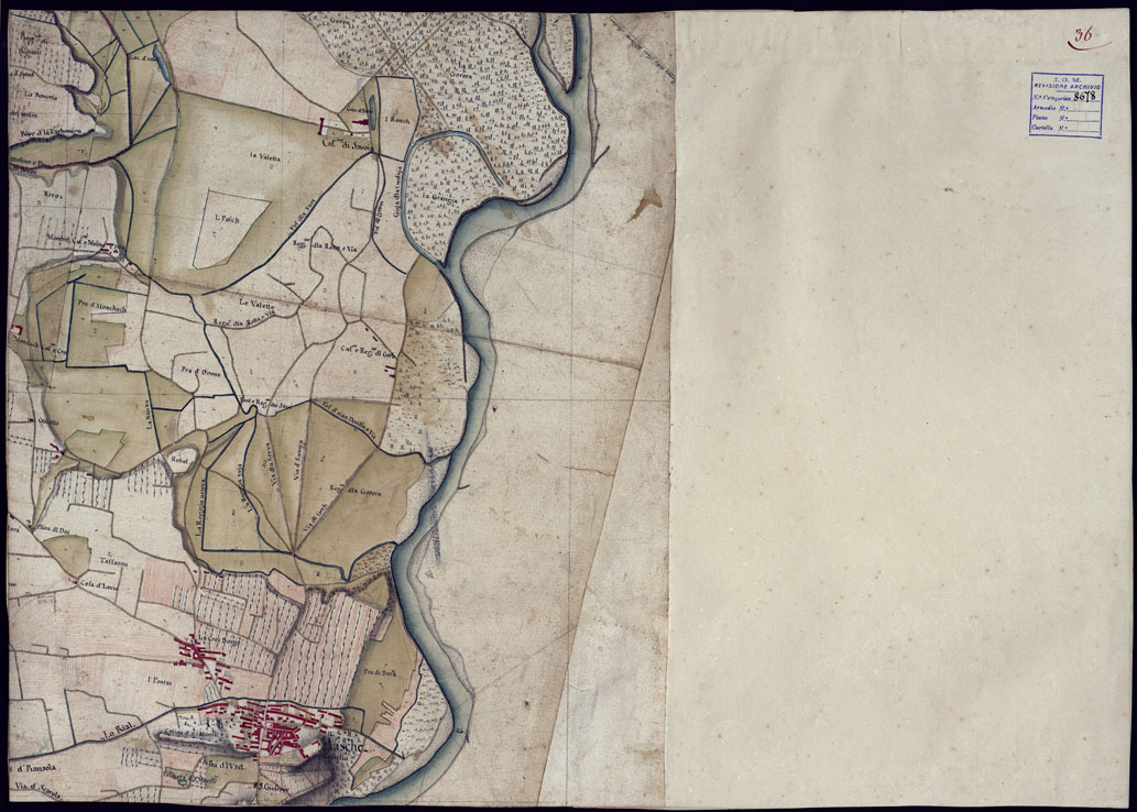"Disegno a penna, in 37 fogli, oltre un quadro d'unione, rappresentante il territorio Canavese e i Comuni limitrofi (Gassino, S. Mauro Torinese, Castiglion Torinese e Pavarolo) e cioè la regione compresa tra Ciriè, S. Mauro, il corso del Po e la Dora Baltea. Scala di 300 trabucchi = m.0,098, pari a 1:9.450. Secondo indicazioni di archivio risulterebbe formato dalla riduzione di mappe catastali. Non porta indicazioni di data , ma si può ritenere del primo quarto del secolo XIX. Sopra alcuni fogli che appaiano diversamente ritagliati da come erano originariamente, si legge: " Originale dai Signor Avico, Borgiotti Cantù e Marchetti". Il disegno, abbastanza accurato, riproduce con notevole precisione, come comporta la scala, tutti i particolari topografici del territorio rappresentato cioè corsi d'acqua, rete stradale, fabbricati, limiti amministrativi. Il rilievo del suolo è rappresentato con ombreggiatura ad acquerello. Mediante colori a segni convenzionali sono indicate le colture e i boschi. Ricchissima anche la toponomastica. In complesso un eccellente documento topografico di grande interesse per lo studio delle variazioni fisiografiche ed antropogeografiche della regione."
