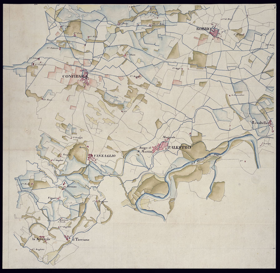 "Otto fogli disegnati a penna ed acquerellati, di dimensioni varie, senza titolo, rappresentanti il territorio a sud e ad ovest di Mortara sino alla Sesia ed al Po. In un angolo del foglio "Santirana" la scala grafica di 1000 trabucchi e l'indicazione che essa è 1/8 di quella di Savoia (1:18.896) circa e la dicitura "Per riduzione conforme all'originale". Torino il mese di marzo 1816. L'Ingegnere Top Porrino". Disegno accurato, ricco di dati topografici e toponomastici. Interessante particolarmente come base di confronto per le trasformazioni idrografiche subite posteriormente dalla regione."