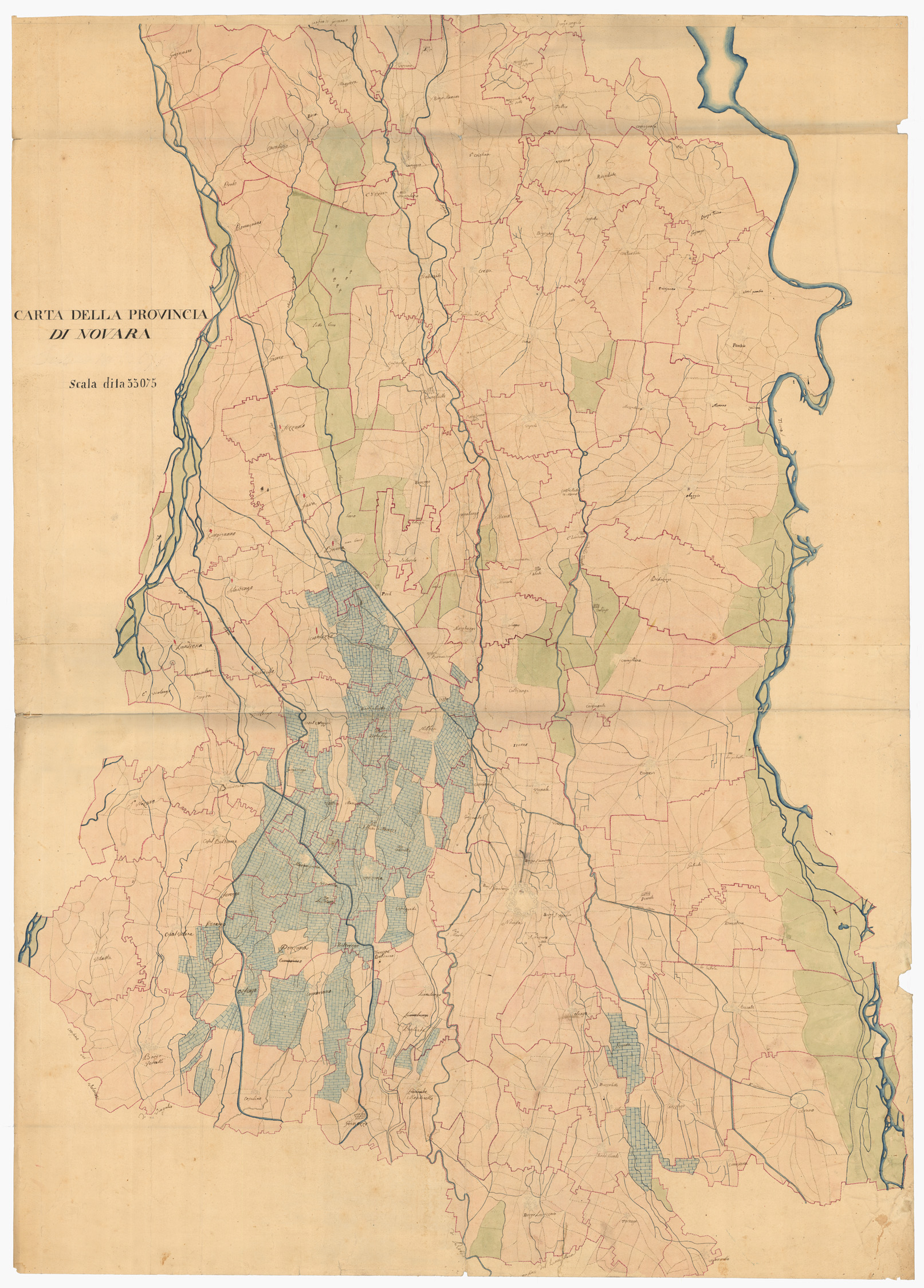 "Disegno a penna ed acquerellato a più tinte, in vari fogli riuniti in un quadro unico rappresentante il Basso Novarese a sud di Grignasco. Sono però segnati i confini dei singoli comuni. Non porta data nè firma ma si può ritenere dei primi del secolo XIX."