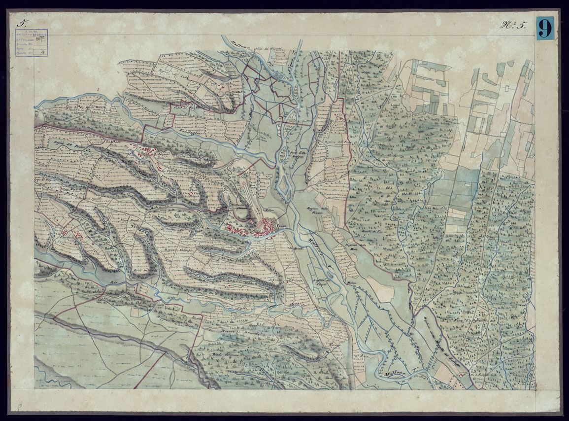 "Copia in bello della carta di cui al documento n. 8, accuratamente disegnata ed acquerellata, e suddivisa in 37 fogli più un quadro d'unione. Da note apposte in margine ad alcuni fogli si deduce che il disegno fu fatto negli anni 1821-22 dai Signori Basso, Bergalli, Brambilla Vittorio, Brignone, Burrio, Conti, Cossato, Gianotti, Rinaudo, Roggero e Valsecchi."