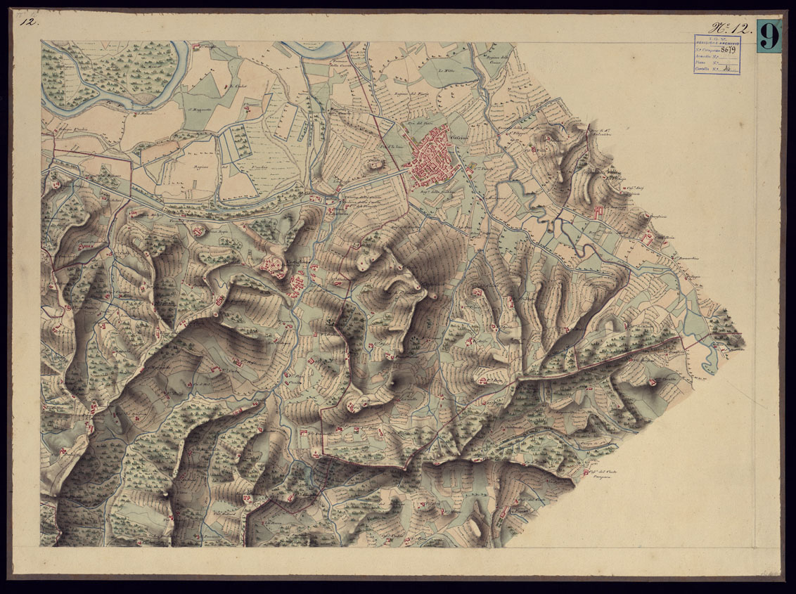 "Copia in bello della carta di cui al (documento n. 8 - n. categorico 8678), accuratamente disegnata ed acquerellata, e come quella suddivisa in 37 fogli più un quadro d'unione. Qualche lieve modificazione nella toponomastica. Da note apposte in margine ad alcuni fogli si deduce che il disegno fu fatto negli anni 1821-22 dai Signori Basso, Bergalli, Brambilla Vittorio, Brignone, Burrio, Conti, Cossato, Gianotti, Rinaudo, Roggero e Valsecchi."
