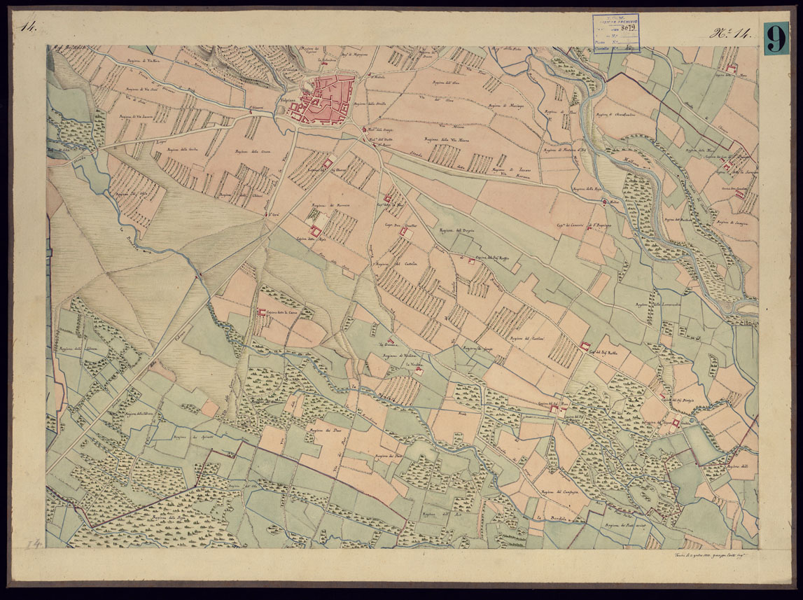 "Copia in bello della carta di cui al (documento n. 8 - n. categorico 8678), accuratamente disegnata ed acquerellata, e come quella suddivisa in 37 fogli più un quadro d'unione. Qualche lieve modificazione nella toponomastica. Da note apposte in margine ad alcuni fogli si deduce che il disegno fu fatto negli anni 1821-22 dai Signori Basso, Bergalli, Brambilla Vittorio, Brignone, Burrio, Conti, Cossato, Gianotti, Rinaudo, Roggero e Valsecchi."