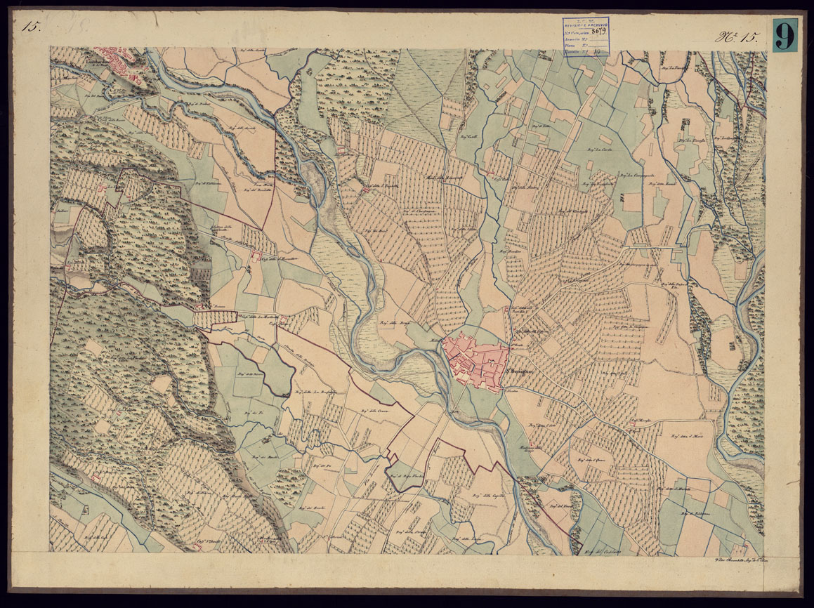 "Copia in bello della carta di cui al documento n. 8, accuratamente disegnata ed acquerellata, e suddivisa in 37 fogli più un quadro d'unione. Da note apposte in margine ad alcuni fogli si deduce che il disegno fu fatto negli anni 1821-22 dai Signori Basso, Bergalli, Brambilla Vittorio, Brignone, Burrio, Conti, Cossato, Gianotti, Rinaudo, Roggero e Valsecchi."