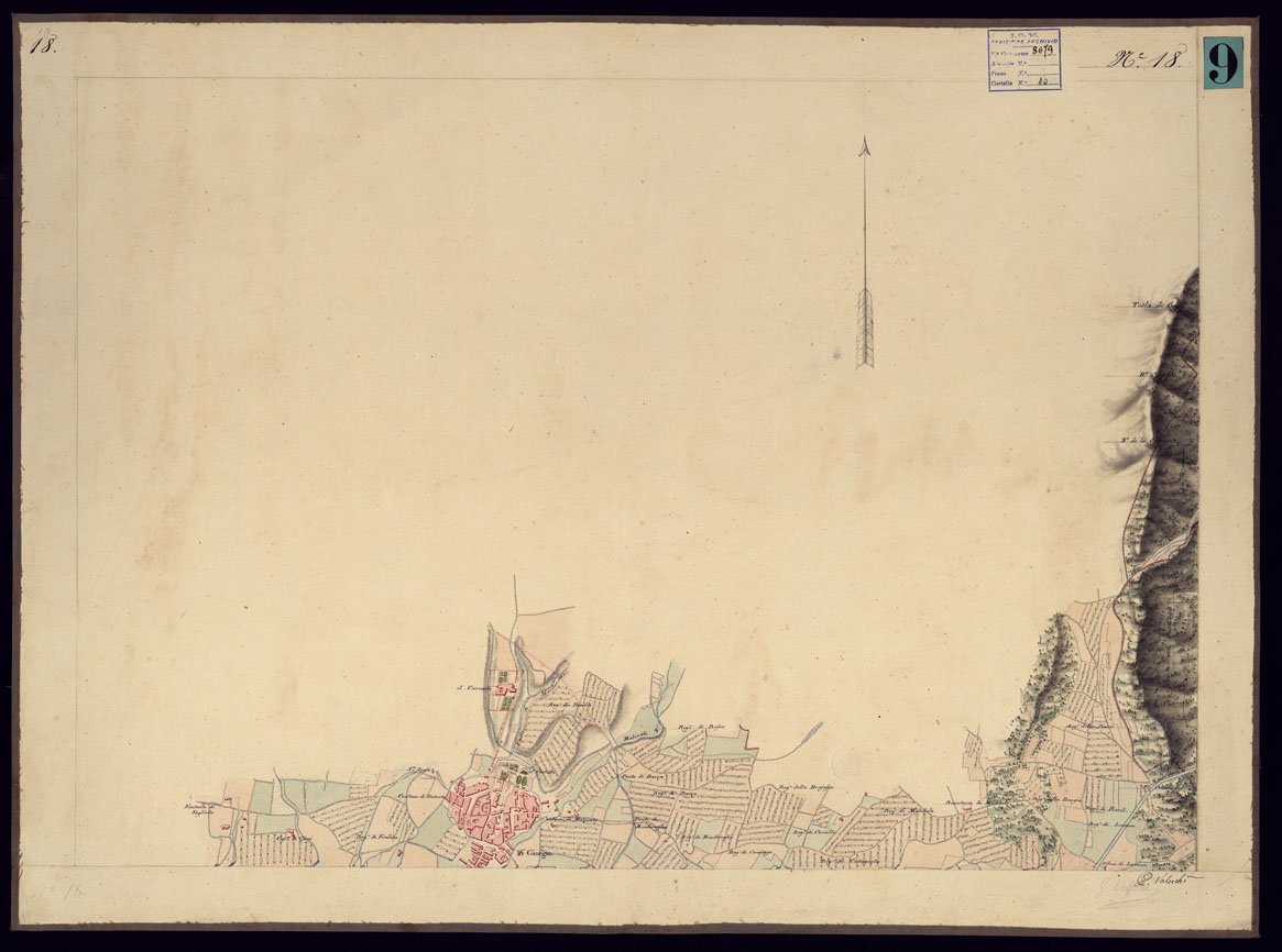 "Copia in bello della carta di cui al documento n. 8, accuratamente disegnata ed acquerellata, e suddivisa in 37 fogli più un quadro d'unione. Da note apposte in margine ad alcuni fogli si deduce che il disegno fu fatto negli anni 1821-22 dai Signori Basso, Bergalli, Brambilla Vittorio, Brignone, Burrio, Conti, Cossato, Gianotti, Rinaudo, Roggero e Valsecchi."