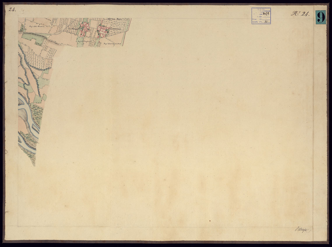 "Copia in bello della carta di cui al documento n. 8, accuratamente disegnata ed acquerellata, e suddivisa in 37 fogli più un quadro d'unione. Da note apposte in margine ad alcuni fogli si deduce che il disegno fu fatto negli anni 1821-22 dai Signori Basso, Bergalli, Brambilla Vittorio, Brignone, Burrio, Conti, Cossato, Gianotti, Rinaudo, Roggero e Valsecchi."