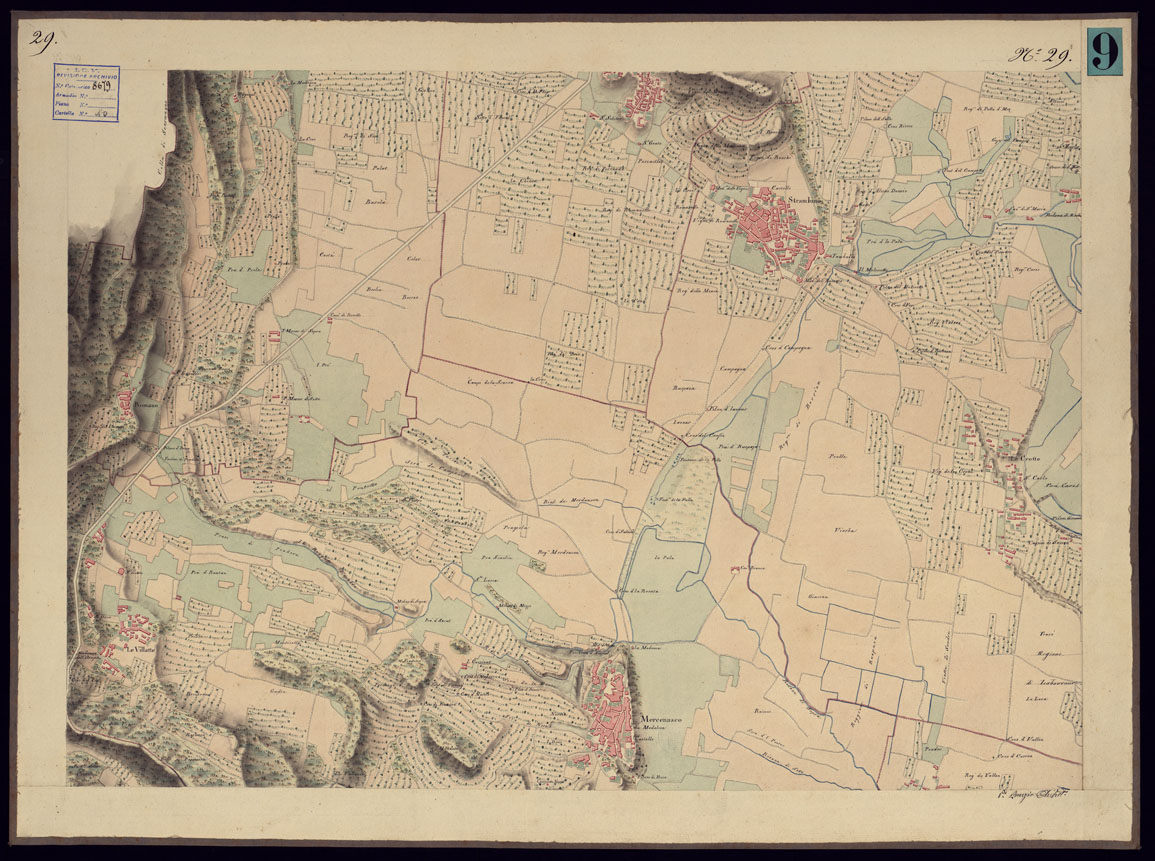 "Copia in bello della carta di cui al documento n. 8, accuratamente disegnata ed acquerellata, e suddivisa in 37 fogli più un quadro d'unione. Da note apposte in margine ad alcuni fogli si deduce che il disegno fu fatto negli anni 1821-22 dai Signori Basso, Bergalli, Brambilla Vittorio, Brignone, Burrio, Conti, Cossato, Gianotti, Rinaudo, Roggero e Valsecchi."