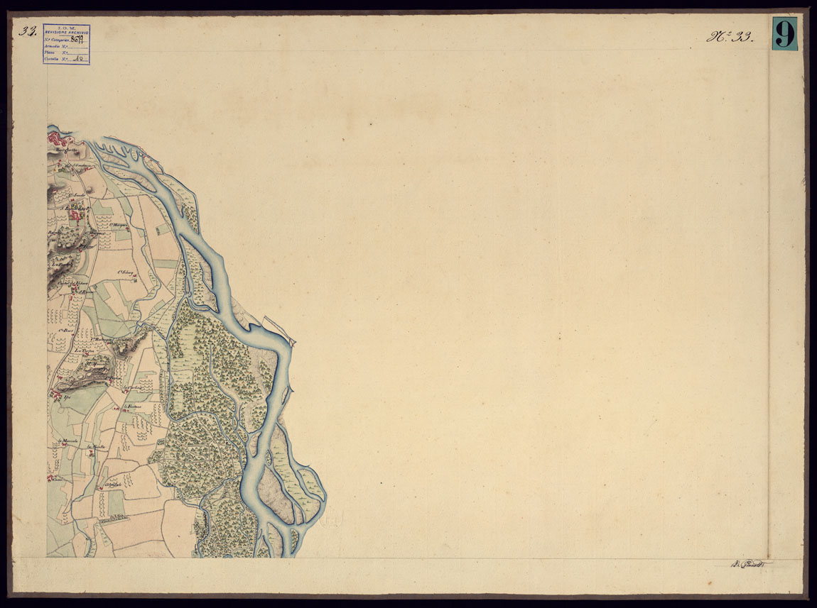 "Copia in bello della carta di cui al documento n. 8, accuratamente disegnata ed acquerellata, e suddivisa in 37 fogli più un quadro d'unione. Da note apposte in margine ad alcuni fogli si deduce che il disegno fu fatto negli anni 1821-22 dai Signori Basso, Bergalli, Brambilla Vittorio, Brignone, Burrio, Conti, Cossato, Gianotti, Rinaudo, Roggero e Valsecchi."