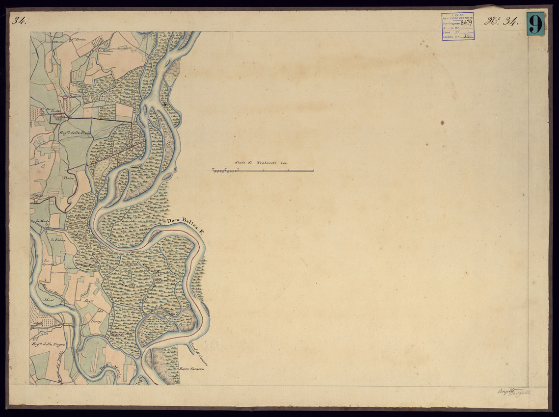 "Copia in bello della carta di cui al documento n. 8, accuratamente disegnata ed acquerellata, e suddivisa in 37 fogli più un quadro d'unione. Da note apposte in margine ad alcuni fogli si deduce che il disegno fu fatto negli anni 1821-22 dai Signori Basso, Bergalli, Brambilla Vittorio, Brignone, Burrio, Conti, Cossato, Gianotti, Rinaudo, Roggero e Valsecchi."