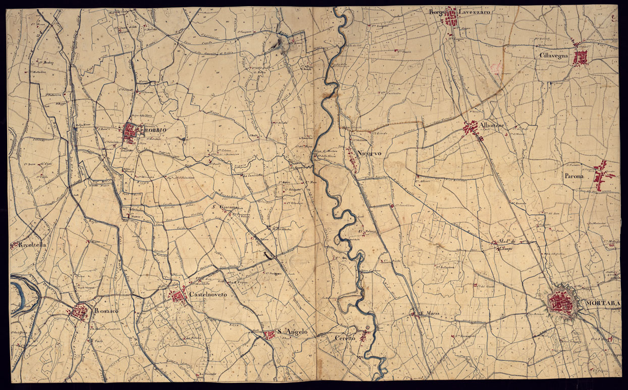 "Disegno a penna a più colori, di esecuzione accurata, in 19 fogli ed un qaudro d'unione, rappresentante il territorio della Lomellina fra Ticino, Sesia e Po. Buon lavoro topografico, ricco d'indicazioni riguardanti particolarmente la rete idrografica, caseggiati e i nomi."