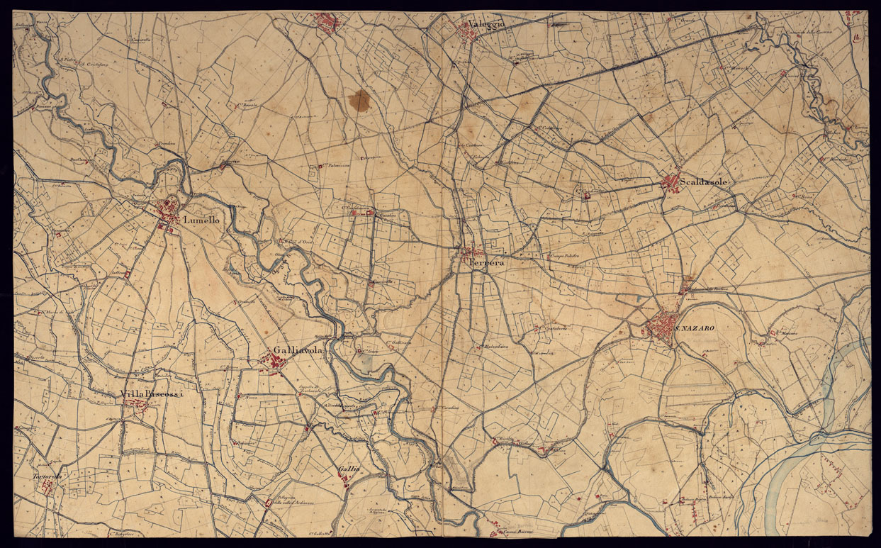 "Disegno a penna a più colori, di esecuzione accurata in 19 fogli ed un quadro d'unione, rappresentante il territorio della Lomellina fra Ticino, Sesia e Po. Buon lavoro topografico ricco d'indicazioni riguardanti particolarmente la rete idrografica, caseggiati e i nomi."