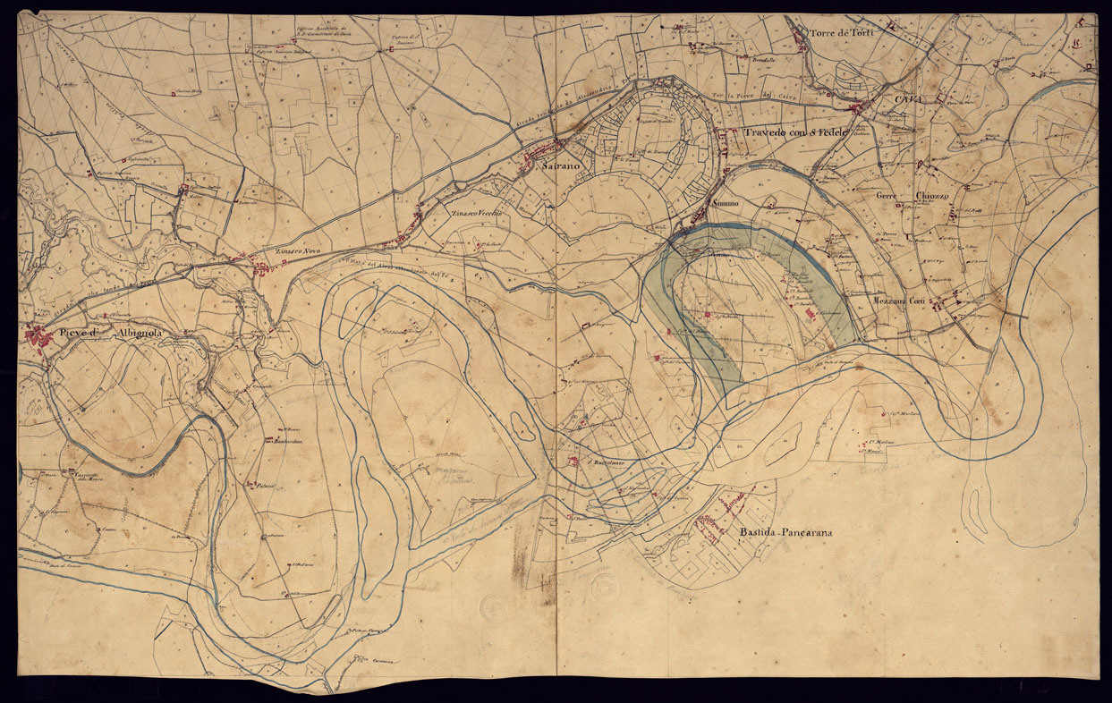 "Disegno a penna a più colori, di esecuzione accurata, in 19 fogli ed un quadro d'unione, rappresentante il territorio della Lomellina fra Ticino, sesia e Po. Buon lavoro topografico ricco d'indicazioni riguardanti particolarmente la rete idrografica, caseggiati e i nomi."