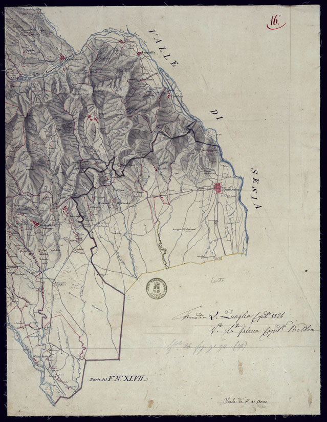 "Ventotto fogli di dimensioni diverse più un quadro d'unione, costituenti l'insieme delle levate topografiche del territorio Novarese tra il Lago Maggiore, il Ticino ad oriente, il Po a sud, le alpi a nord e il meridiano di Ivrea a ovest. La maggior parte dei fogli porta in calce la seguente dicitura: "Riconosciuto e fatto sul terreno nella Campagna dell'anno 1824 per essere unito al rapporto che lo concerne" a seguire la firma del capitano dello Stato Maggiore Generale che lo ha validato (Bergalli, Conte Salasco, Conte Castellengo, ecc). Disegno topografico eccellente. Orografia rappresentata con ombreggiatura ad acquerello. Confrontata con la carta degli Stati di S.M. Sarda in terraferma alla scala di 1:50.000 appare assai più accurata nel disegno orografico e maggiori sono i dati toponomastici."