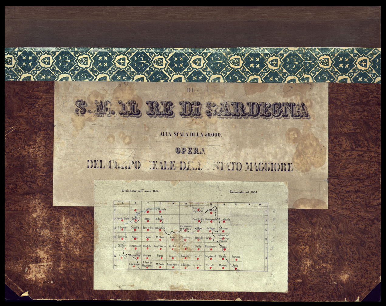 CARTA TOPOGRAFICA DEGLI STATI DI TERRA FERMA DI S.S.R.M. CARLO ALBERTO RE DI SARDEGNA FATTA DAL CORPO DELLO STATO MAGGIORE COMANDATO DAL TEN.TE GEN.LE B.NE DI MONTHOUX ALLA SCALA DI 1 50.000 1831 - COPERTINA QUADRO D'UNIONE.