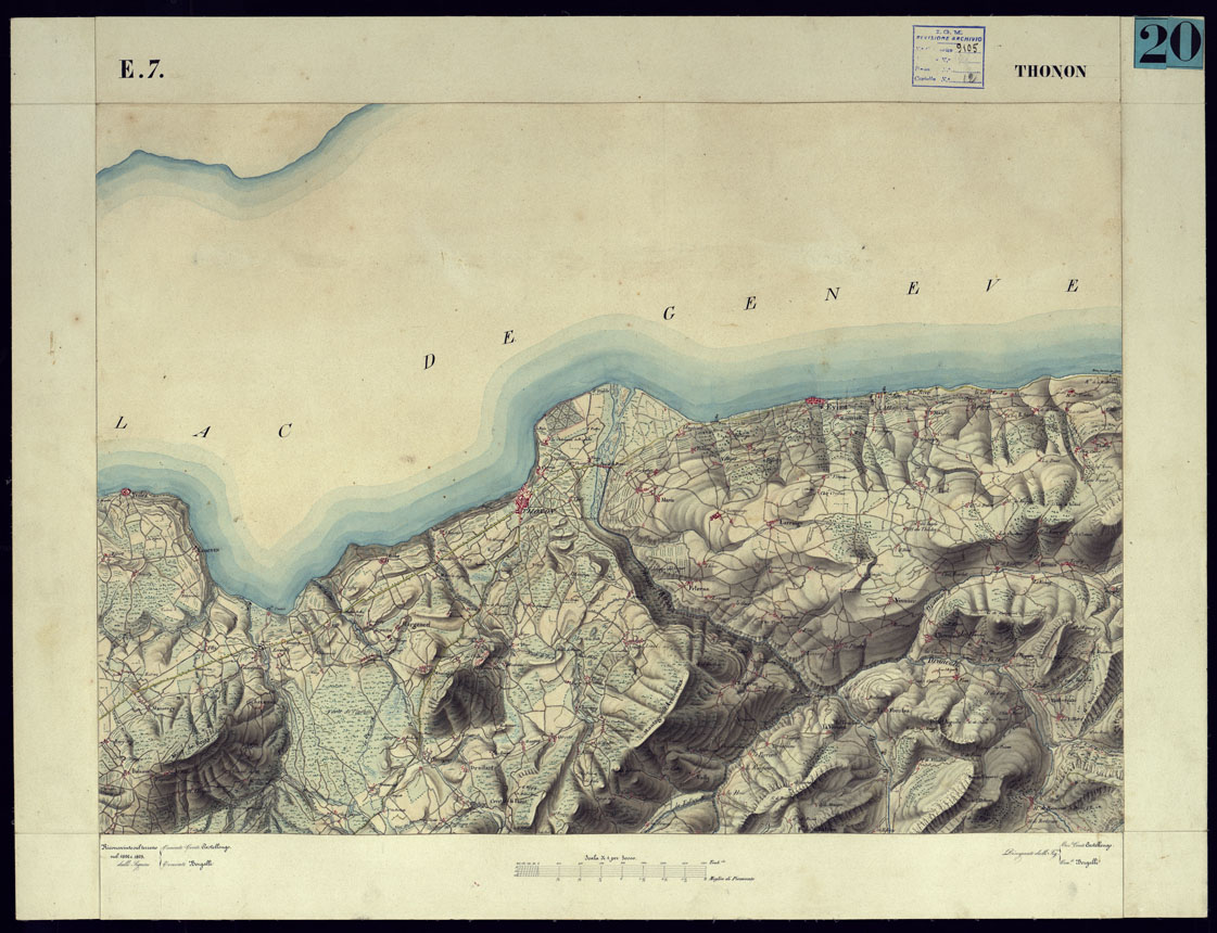 CARTA TOPOGRAFICA DEGLI STATI DI TERRA FERMA DI S.S.R.M. CARLO ALBERTO RE DI SARDEGNA FATTA DAL CORPO DELLO STATO MAGGIORE COMANDATO DAL TEN.TE GEN.LE B.NE DI MONTHOUX ALLA SCALA DI 1 50.000 1831 - FOGLIO E.7 THONON.