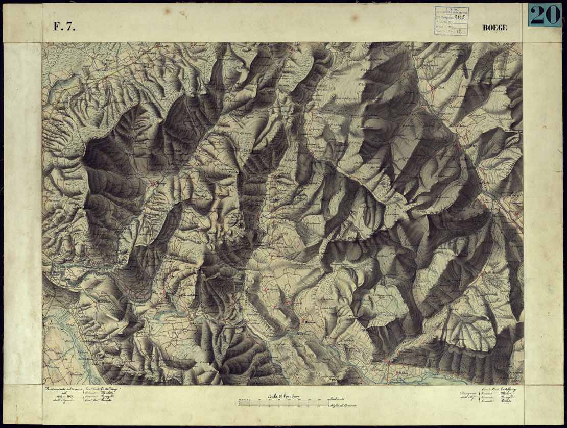 CARTA TOPOGRAFICA DEGLI STATI DI TERRA FERMA DI S.S.R.M. CARLO ALBERTO RE DI SARDEGNA FATTA DAL CORPO DELLO STATO MAGGIORE COMANDATO DAL TEN.TE GEN.LE B.NE DI MONTHOUX ALLA SCALA DI 1 50.000 1831 - FOGLIO F.7 BOEGE.