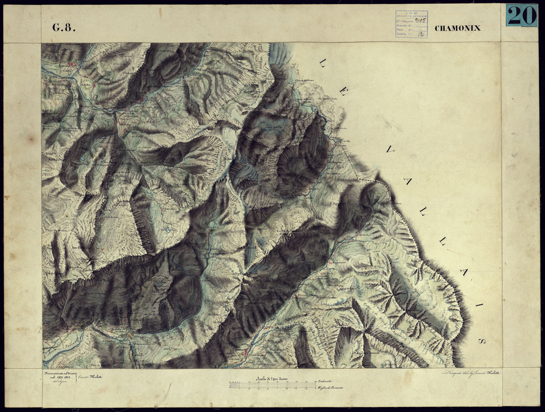CARTA TOPOGRAFICA DEGLI STATI DI TERRA FERMA DI S.S.R.M. CARLO ALBERTO RE DI SARDEGNA FATTA DAL CORPO DELLO STATO MAGGIORE COMANDATO DAL TEN.TE GEN.LE B.NE DI MONTHOUX ALLA SCALA DI 1 50.000 1831 - FOGLIO G.8 CHAMONIX.
