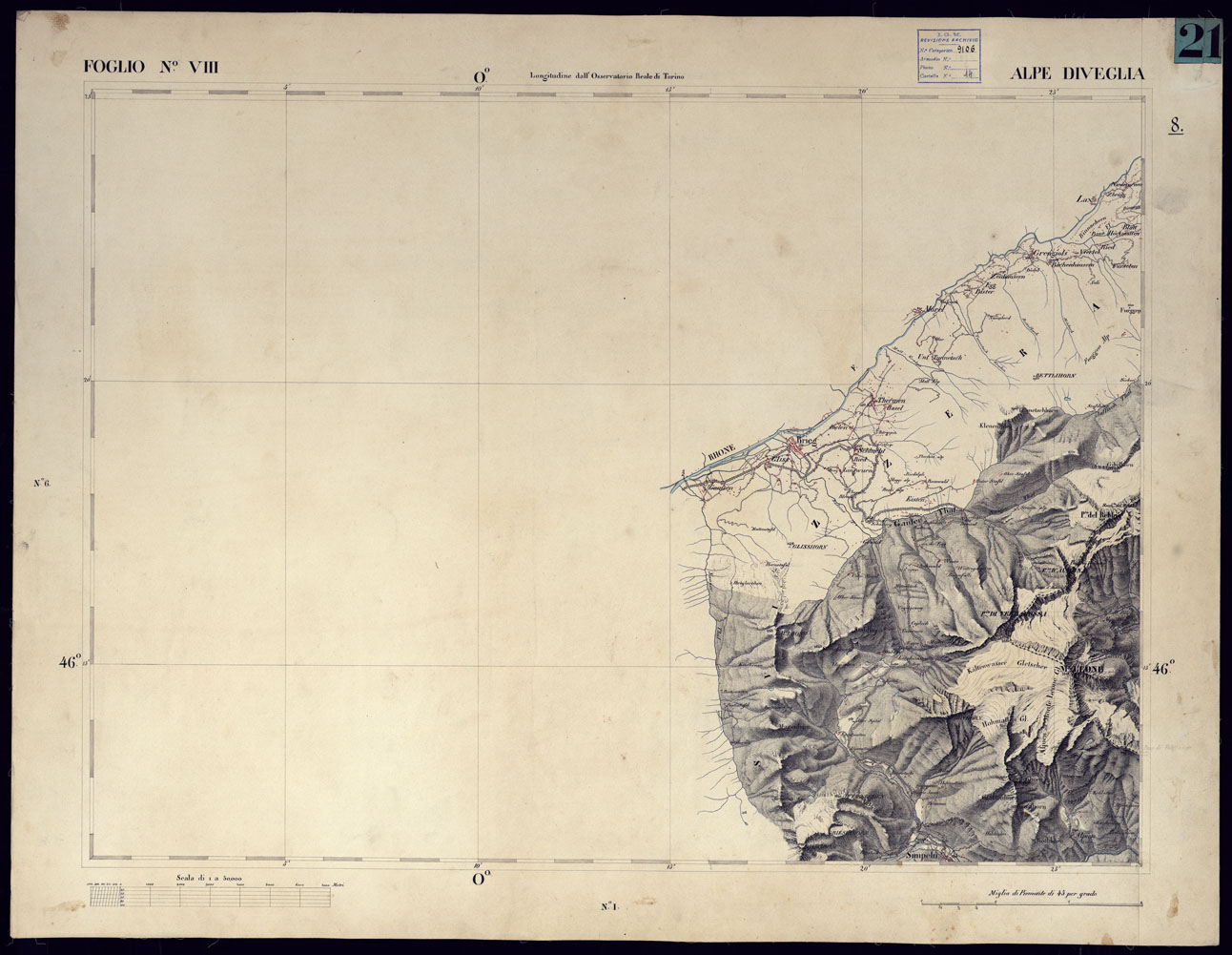 CARTA TOPOGRAFICA DEGLI STATI IN TERRAFERMA DI S.M. IL RE DI SARDEGNA ALLA SCALA DI 1 A 50.000 OPERA DEL CORPO REALE DELLO STATO MAGGIORE - FOGLIO N°VIII ALPE DIVEGLIA