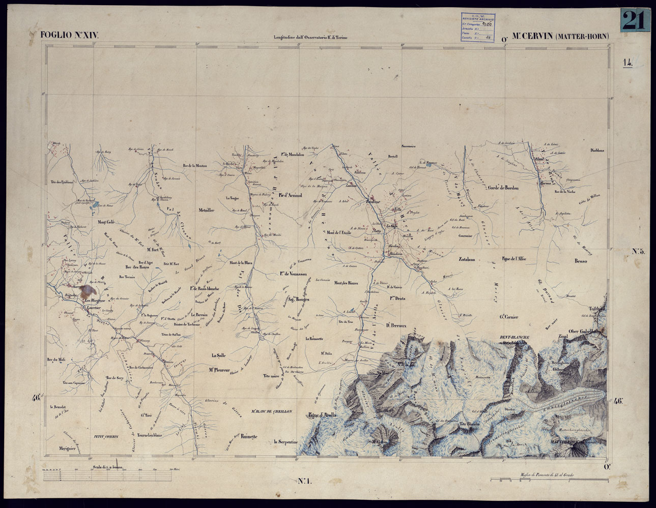 CARTA TOPOGRAFICA DEGLI STATI IN TERRAFERMA DI S.M. IL RE DI SARDEGNA ALLA SCALA DI 1 A 50.000 OPERA DEL CORPO REALE DELLO STATO MAGGIORE - FOGLIO N°XIV M. CERVIN (MATTER - HORN)