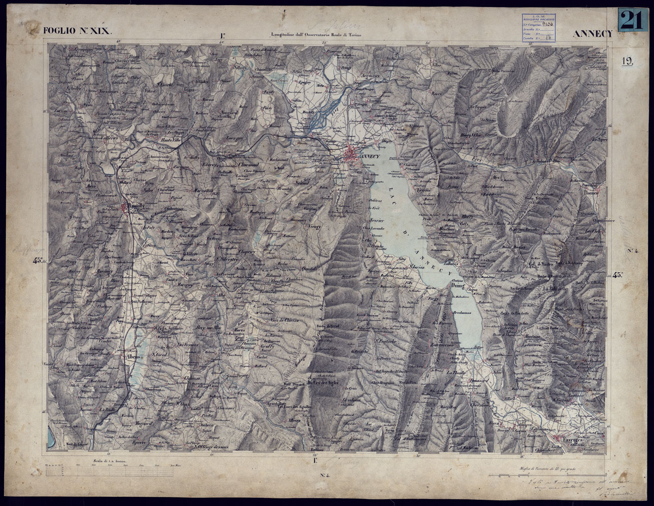 CARTA TOPOGRAFICA DEGLI STATI IN TERRAFERMA DI S.M. IL RE DI SARDEGNA ALLA SCALA DI 1 A 50.000 OPERA DEL CORPO REALE DELLO STATO MAGGIORE - FOGLIO N°XIX ANNECY