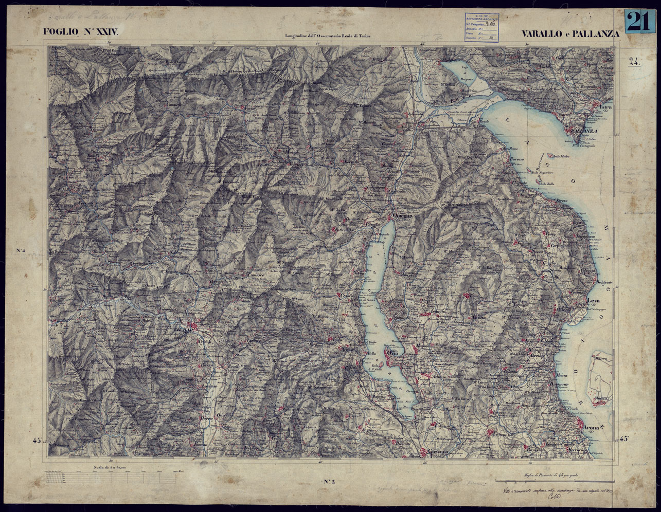 CARTA TOPOGRAFICA DEGLI STATI IN TERRAFERMA DI S.M. IL RE DI SARDEGNA ALLA SCALA DI 1 A 50.000 OPERA DEL CORPO REALE DELLO STATO MAGGIORE - FOGLIO N°XXIV VARALLO E PALLANZA