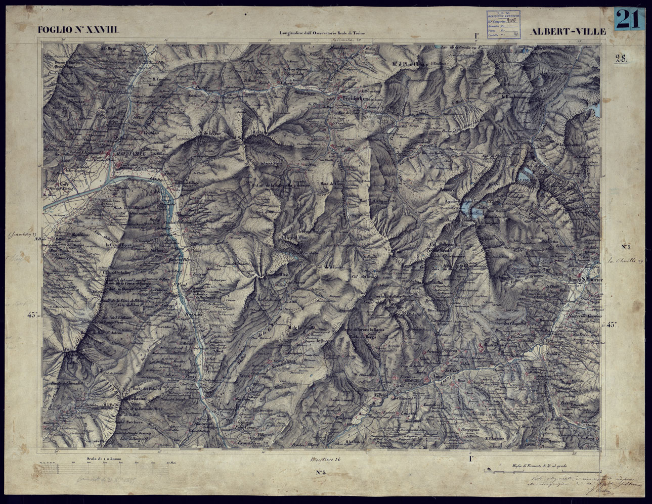 CARTA TOPOGRAFICA DEGLI STATI IN TERRAFERMA DI S.M. IL RE DI SARDEGNA ALLA SCALA DI 1 A 50.000 OPERA DEL CORPO REALE DELLO STATO MAGGIORE - FOGLIO N°XXVIII ALBERT-VILLE