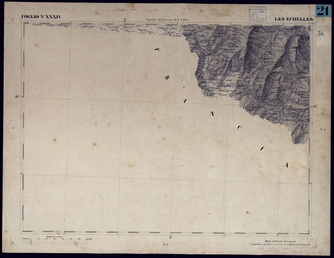 CARTA TOPOGRAFICA DEGLI STATI IN TERRAFERMA DI S.M. IL RE DI SARDEGNA ALLA SCALA DI 1 A 50.000 OPERA DEL CORPO REALE DELLO STATO MAGGIORE - FOGLIO N°XXXIV LES ECHELLES