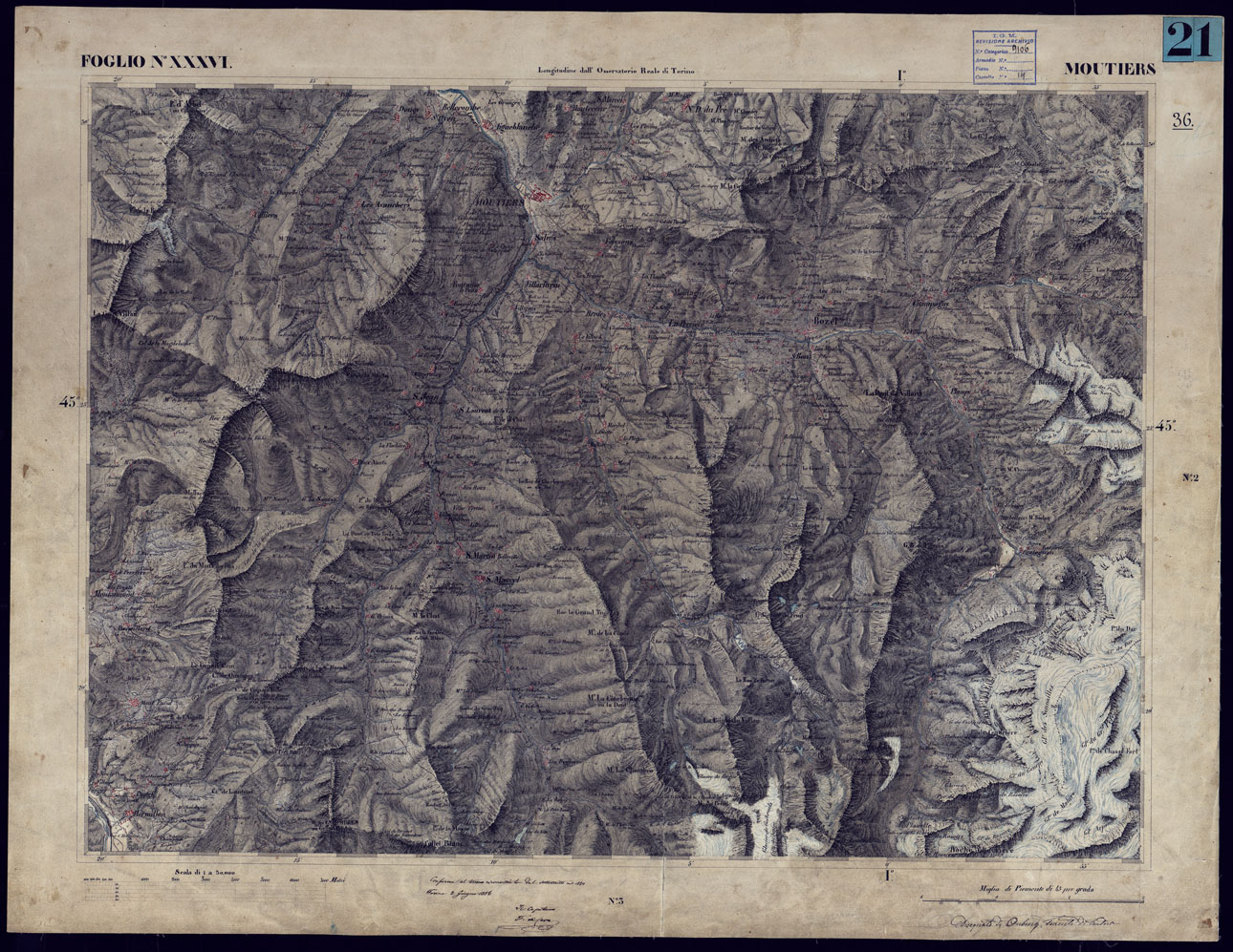 CARTA TOPOGRAFICA DEGLI STATI IN TERRAFERMA DI S.M. IL RE DI SARDEGNA ALLA SCALA DI 1 A 50.000 OPERA DEL CORPO REALE DELLO STATO MAGGIORE - FOGLIO N°XXXVI MOUTIERS