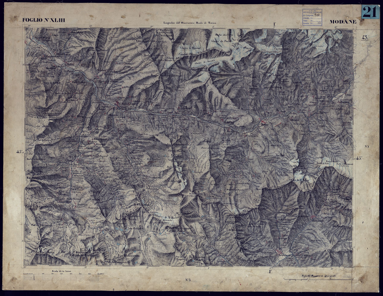 CARTA TOPOGRAFICA DEGLI STATI IN TERRAFERMA DI S.M. IL RE DI SARDEGNA ALLA SCALA DI 1 A 50.000 OPERA DEL CORPO REALE DELLO STATO MAGGIORE - FOGLIO N°XLIII MODANE