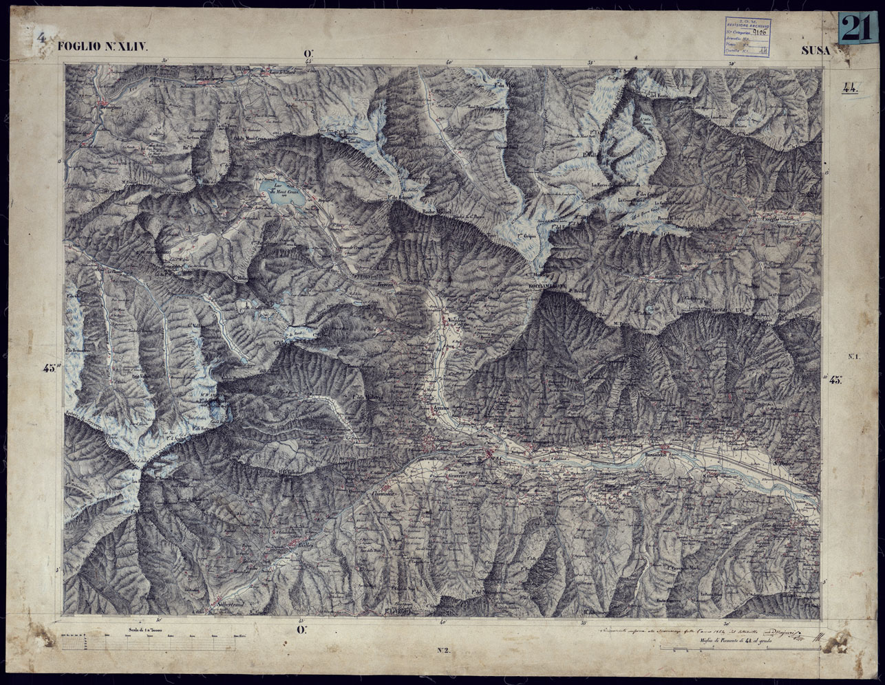 CARTA TOPOGRAFICA DEGLI STATI IN TERRAFERMA DI S.M. IL RE DI SARDEGNA ALLA SCALA DI 1 A 50.000 OPERA DEL CORPO REALE DELLO STATO MAGGIORE - FOGLIO N°XLIV - SUSA