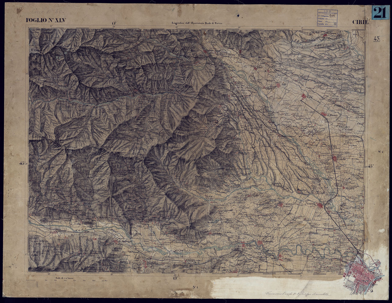 CARTA TOPOGRAFICA DEGLI STATI IN TERRAFERMA DI S.M. IL RE DI SARDEGNA ALLA SCALA DI 1 A 50.000 OPERA DEL CORPO REALE DELLO STATO MAGGIORE - FOGLIO N°XLV CIRIE'