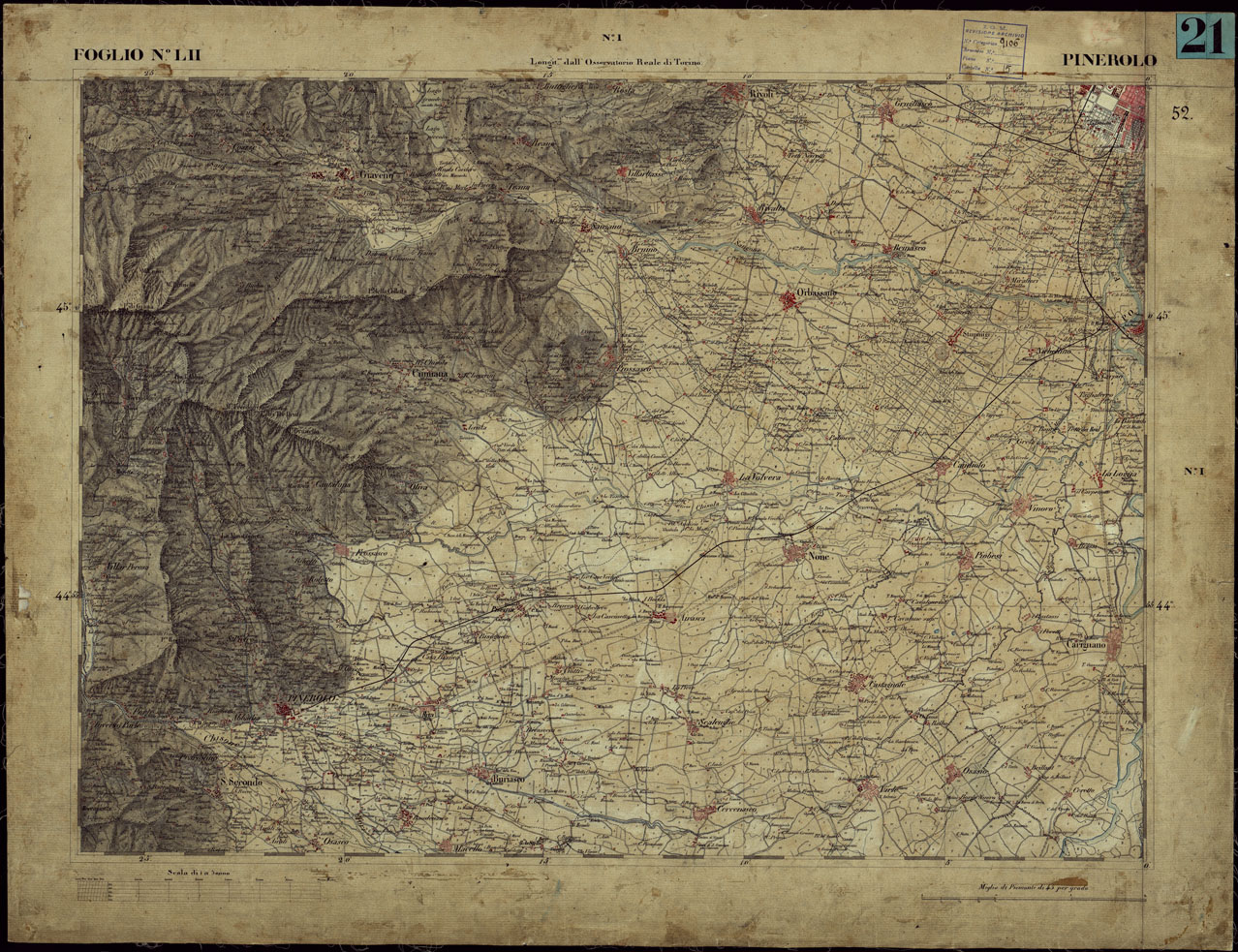 CARTA TOPOGRAFICA DEGLI STATI IN TERRAFERMA DI S.M. IL RE DI SARDEGNA ALLA SCALA DI 1 A 50.000 OPERA DEL CORPO REALE DELLO STATO MAGGIORE - FOGLIO N°LII PINEROLO