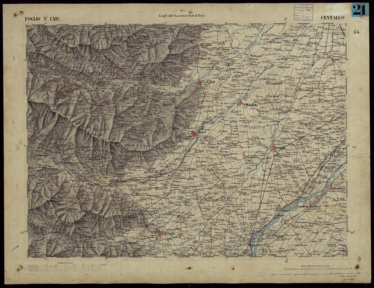 CARTA TOPOGRAFICA DEGLI STATI IN TERRAFERMA DI S.M. IL RE DI SARDEGNA ALLA SCALA DI 1 A 50.000 OPERA DEL CORPO REALE DELLO STATO MAGGIORE - FOGLIO N°LXIV CENTALLO