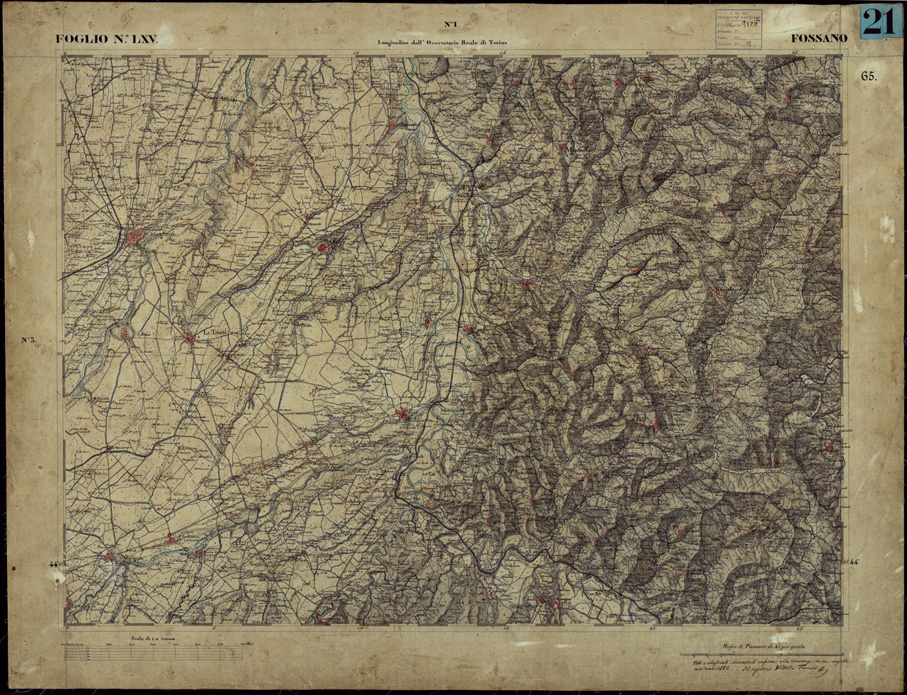 CARTA TOPOGRAFICA DEGLI STATI IN TERRAFERMA DI S.M. IL RE DI SARDEGNA ALLA SCALA DI 1 A 50.000 OPERA DEL CORPO REALE DELLO STATO MAGGIORE - FOGLIO N°LXV FOSSANO