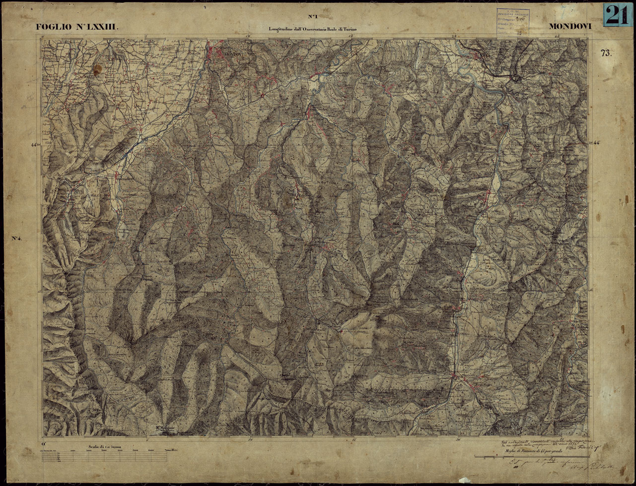 CARTA TOPOGRAFICA DEGLI STATI IN TERRAFERMA DI S.M. IL RE DI SARDEGNA ALLA SCALA DI 1 A 50.000 OPERA DEL CORPO REALE DELLO STATO MAGGIORE - FOGLIO N°LXXIII MONDOVI'